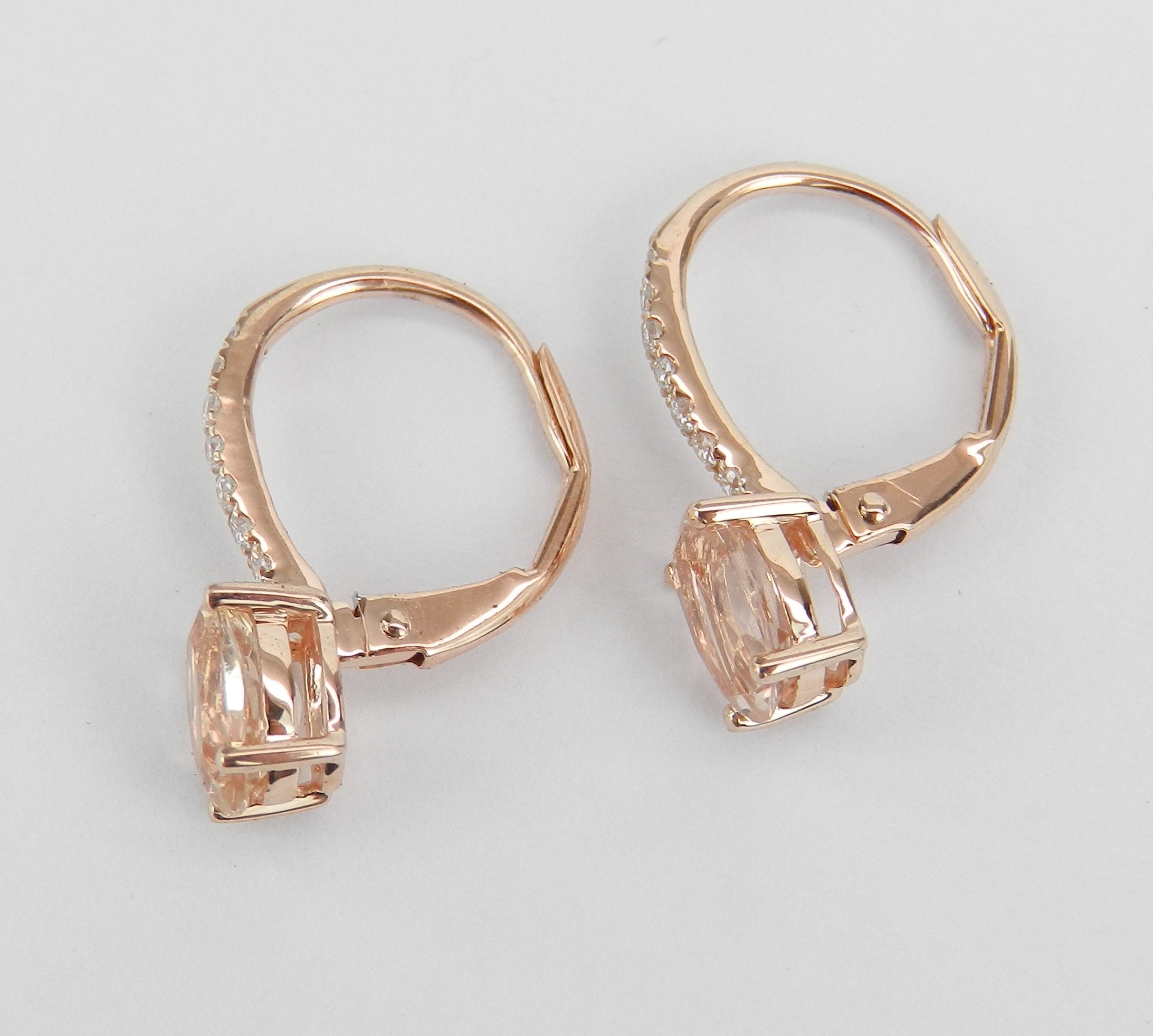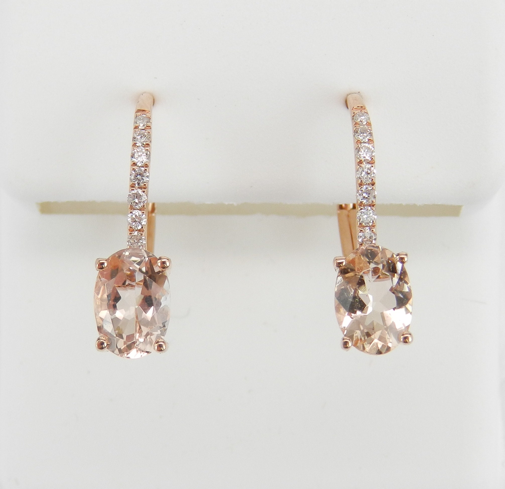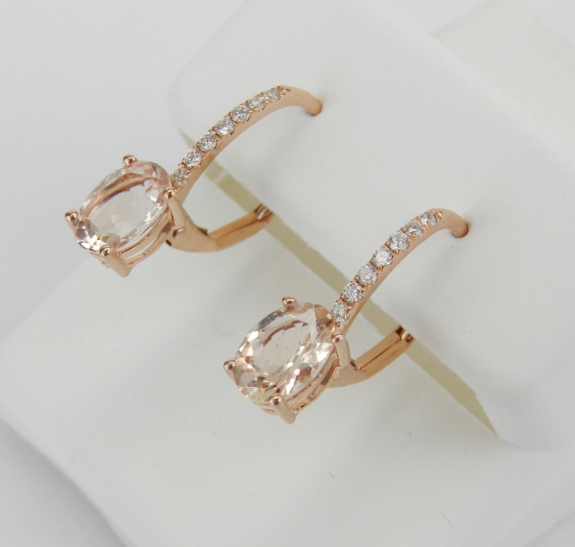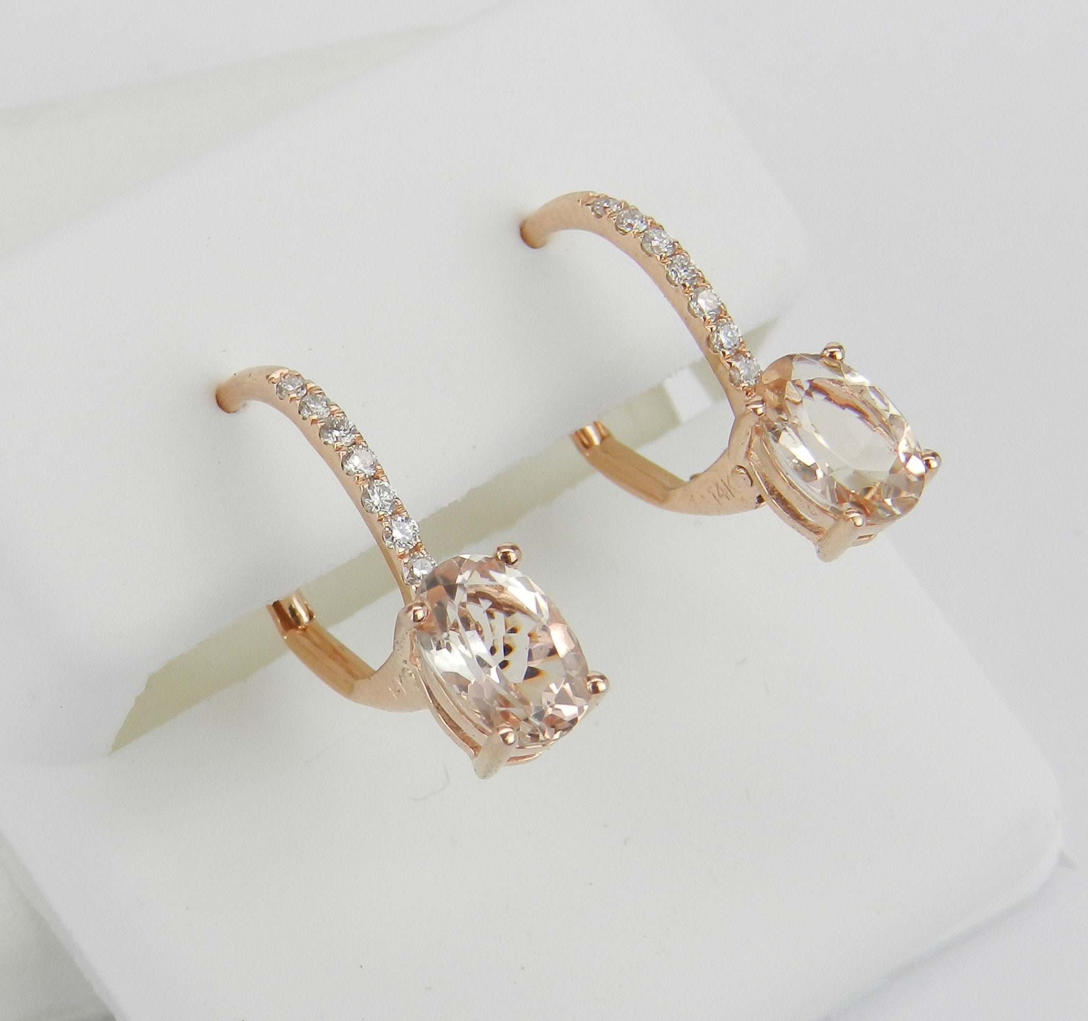 14K Rose Gold Diamond and Morganite Drop Earrings. There are two genuine Oval Morganite and fourteen natural Round Diamonds set in these earrings. The Morganite in these earrings are a peachy/pink color, measure 7 X 5 mm, are VS1 in clarity and weigh a total of 1 1/4 carat. The diamonds in these earrings are G color, SI1 clarity and weigh a total of .20 carat. These earrings are 14KT Rose Gold, measure 17 mm in length and weigh a total of 2.0 grams. These earrings are for pierced ears and have leverback clasps. These earrings will be accompanied by an appraisal written by a GIA Certified Diamond Grader with the retail replacement value of $1,589.00. I will ship these earrings promptly in a gift box.