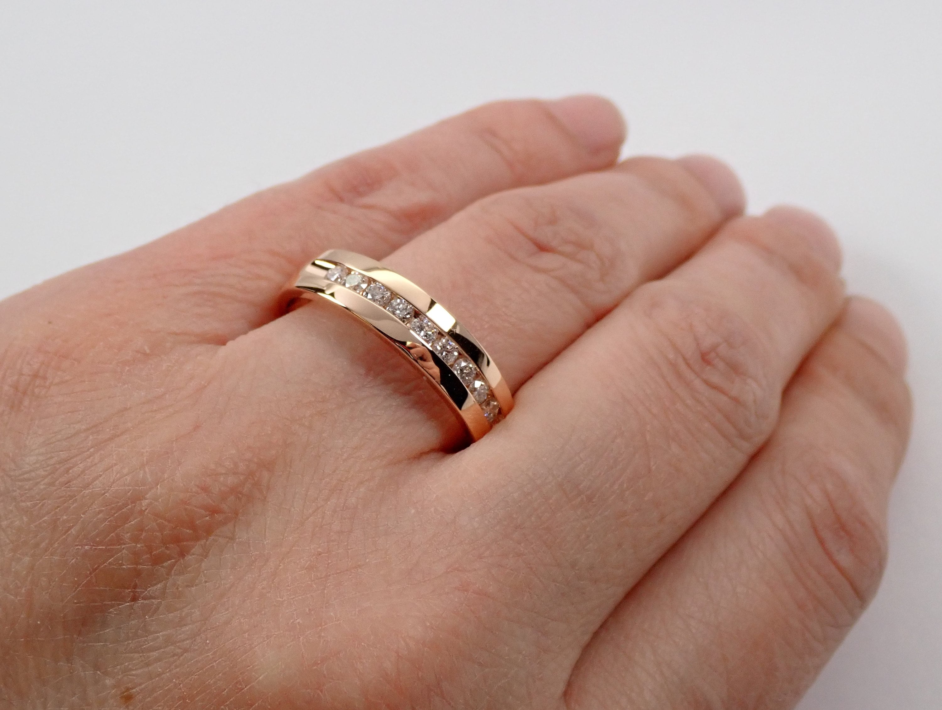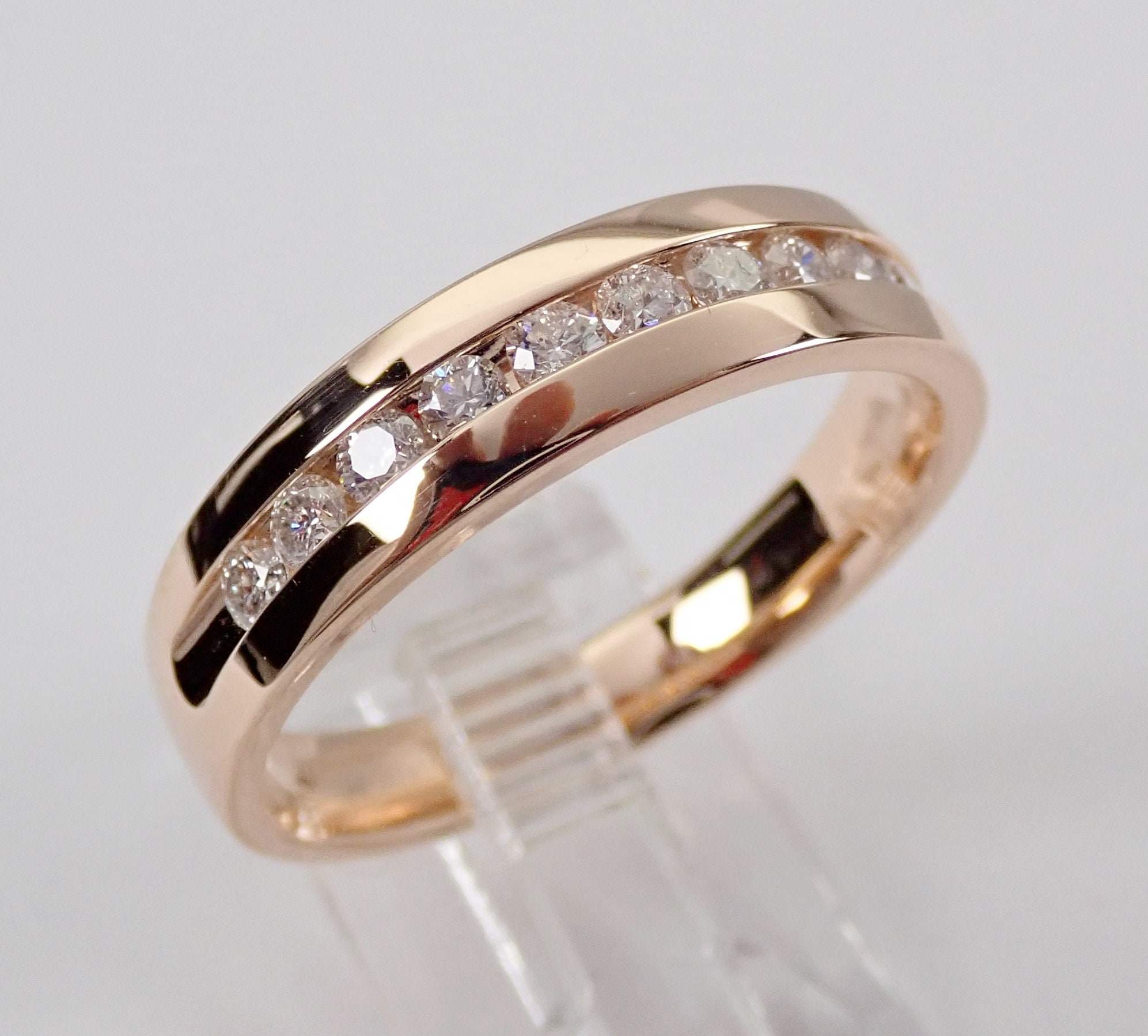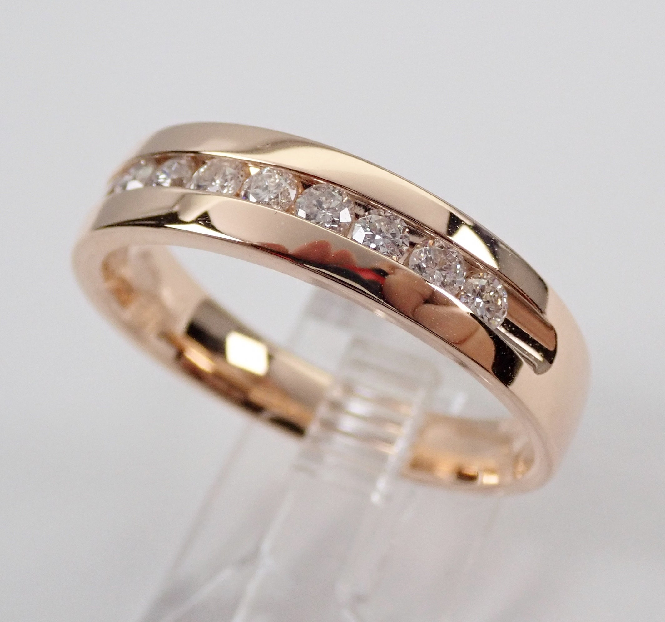 Men's 14K Rose Gold Diamond Wedding Ring Anniversary Band. This men's wedding ring is set with ten genuine, natural Round Brilliant Diamonds. These Diamonds are G color, SI/I1 clarity and weigh a total of 1/2 carat. This ring is 14KT Rose Gold, weighs 5.7 grams, measures 5 mm in width and is a finger size 10 1/4, can be resized (please inquire about sizing with the finger size you need). This ring will be accompanied by an appraisal by a GIA Certified Diamond Grader with the retail replacement value of $1,789.00. I will ship this ring promptly in a gift box.