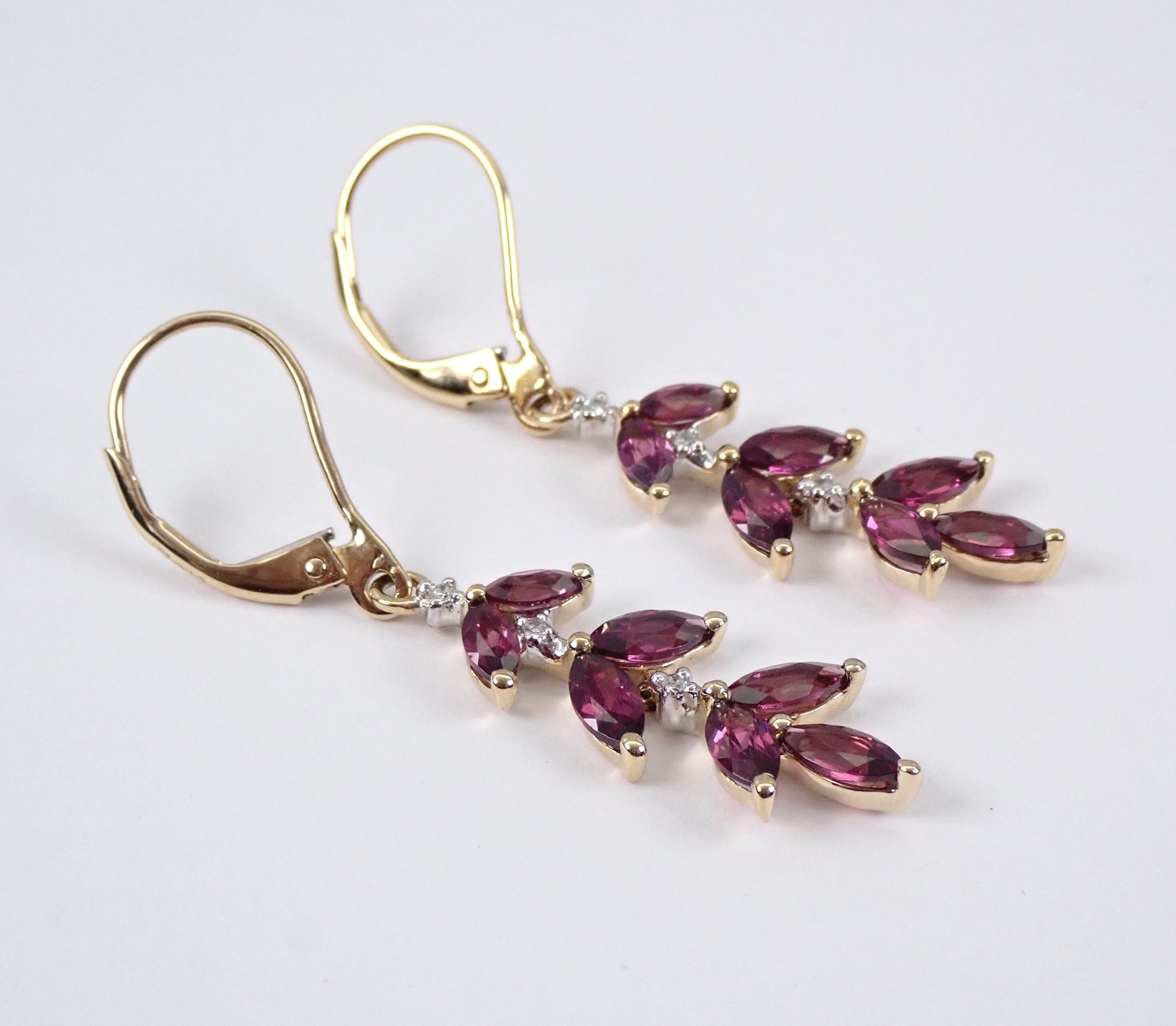 14K Yellow Gold Diamond and Rhodolite Garnet Dangle Earrings. There are seven Marquise Rhodolite Garnets and three Round Brilliant Diamonds set in EACH earring. The garnets are a beautiful Raspberry color and amount to a total weight of 3/4 carat. These diamonds are H color, SI clarity and weigh a total of .07 carat. These earrings are 14KT Yellow Gold and weigh a total of 2.8 grams. These earrings are for pierced ears, measure 1 1/2" in length and the earrings have leverback clasps. These earrings will be accompanied by an appraisal written by a GIA Certified Diamond Grader with the retail replacement value of $1,459.00. I will ship these earrings promptly in a gift box.