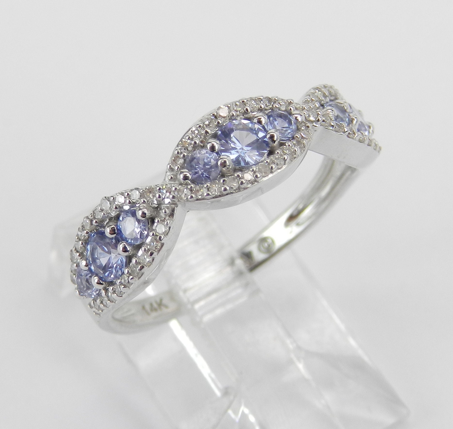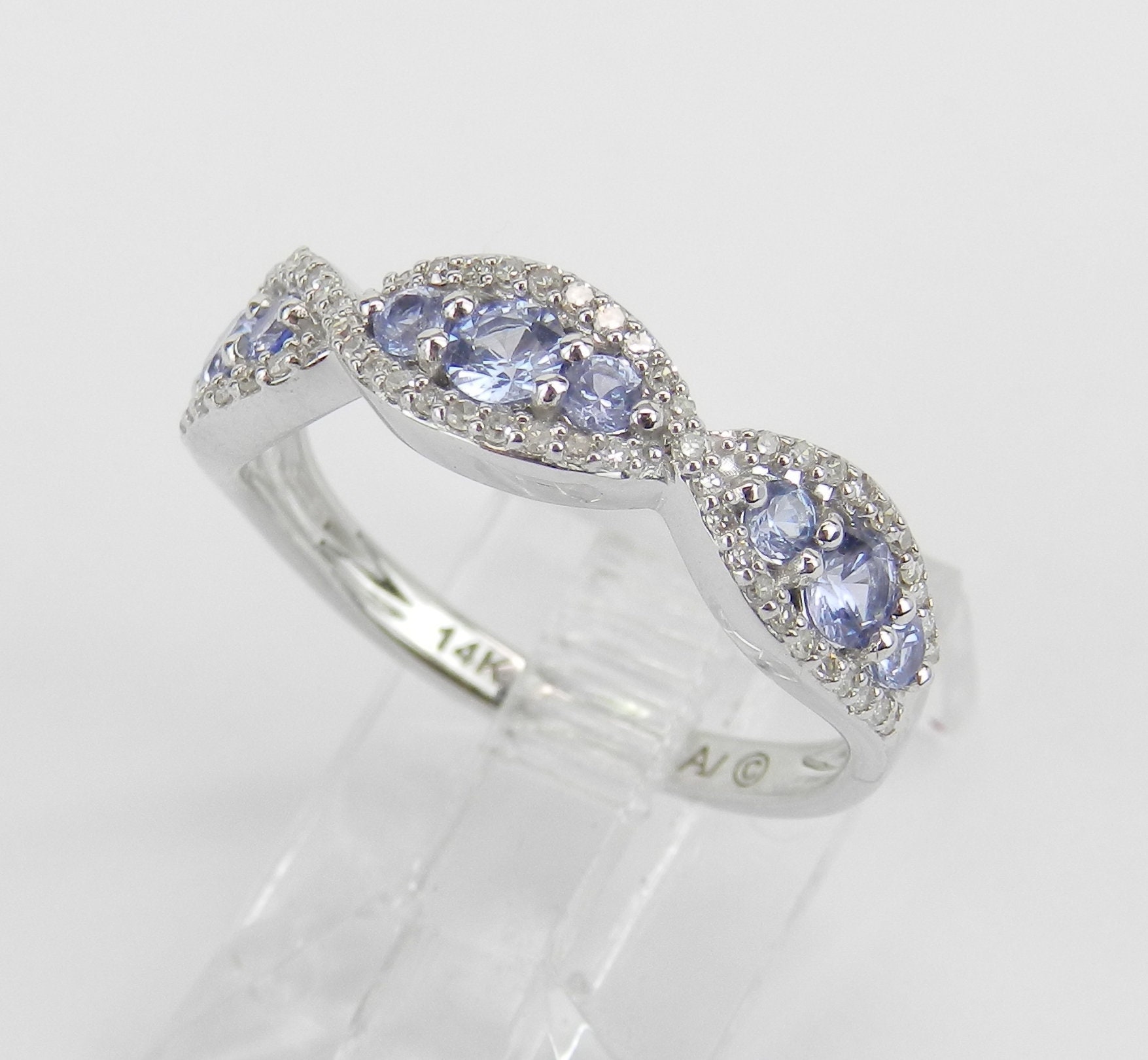 14K White Gold Diamond and Tanzanite Wedding Ring Anniversary Band. This ring set with nine genuine Round Tanzanites and sixty-four Round Brilliant Diamonds. These Tanzanites are a light purple color and amount to a total weight of .30 carat. The diamonds are H color, SI1 clarity and weigh a total of .25 carat. This ring is 14KT White Gold, weighs 2.7 grams, measures 5.5 mm in width and is a finger size 7, which can be resized (please inquire about sizing with the finger size you need). This ring will be accompanied by an appraisal by a GIA Certified Diamond Grader with the retail replacement value of $1,349.00. I will ship this ring promptly in a beautiful gift box.