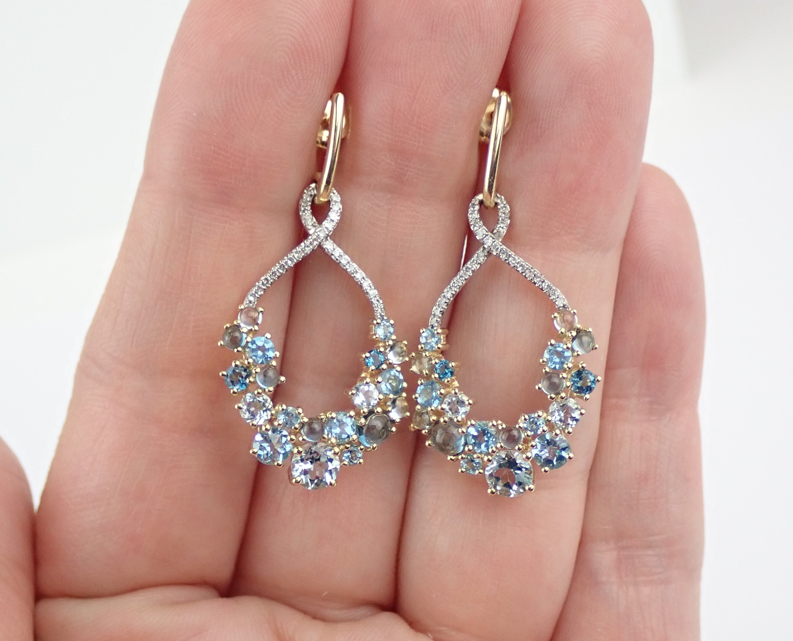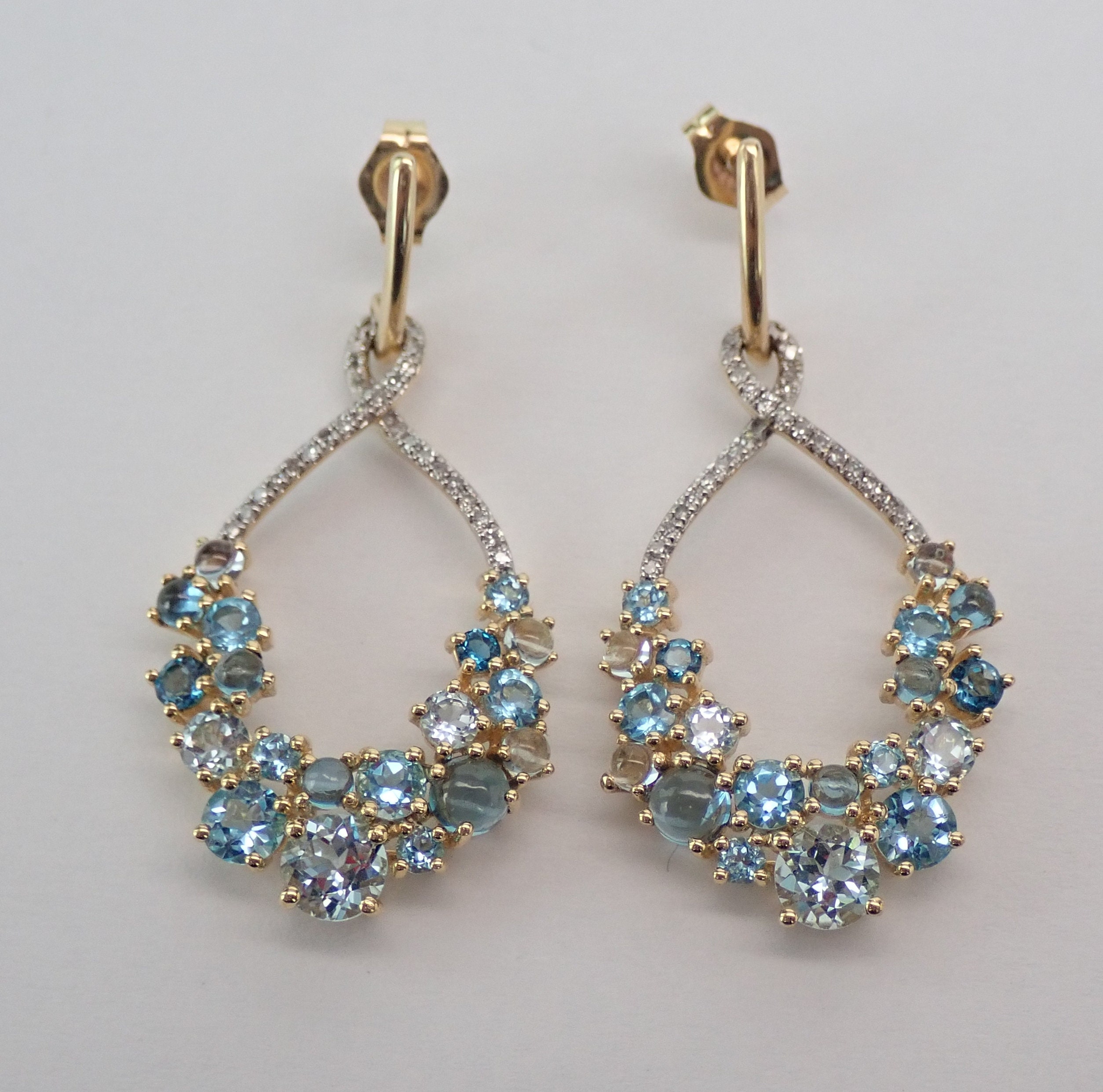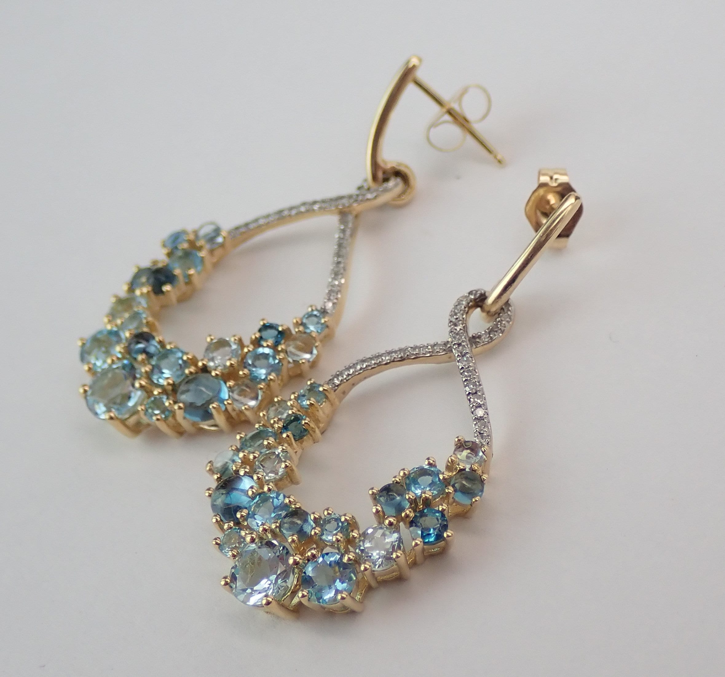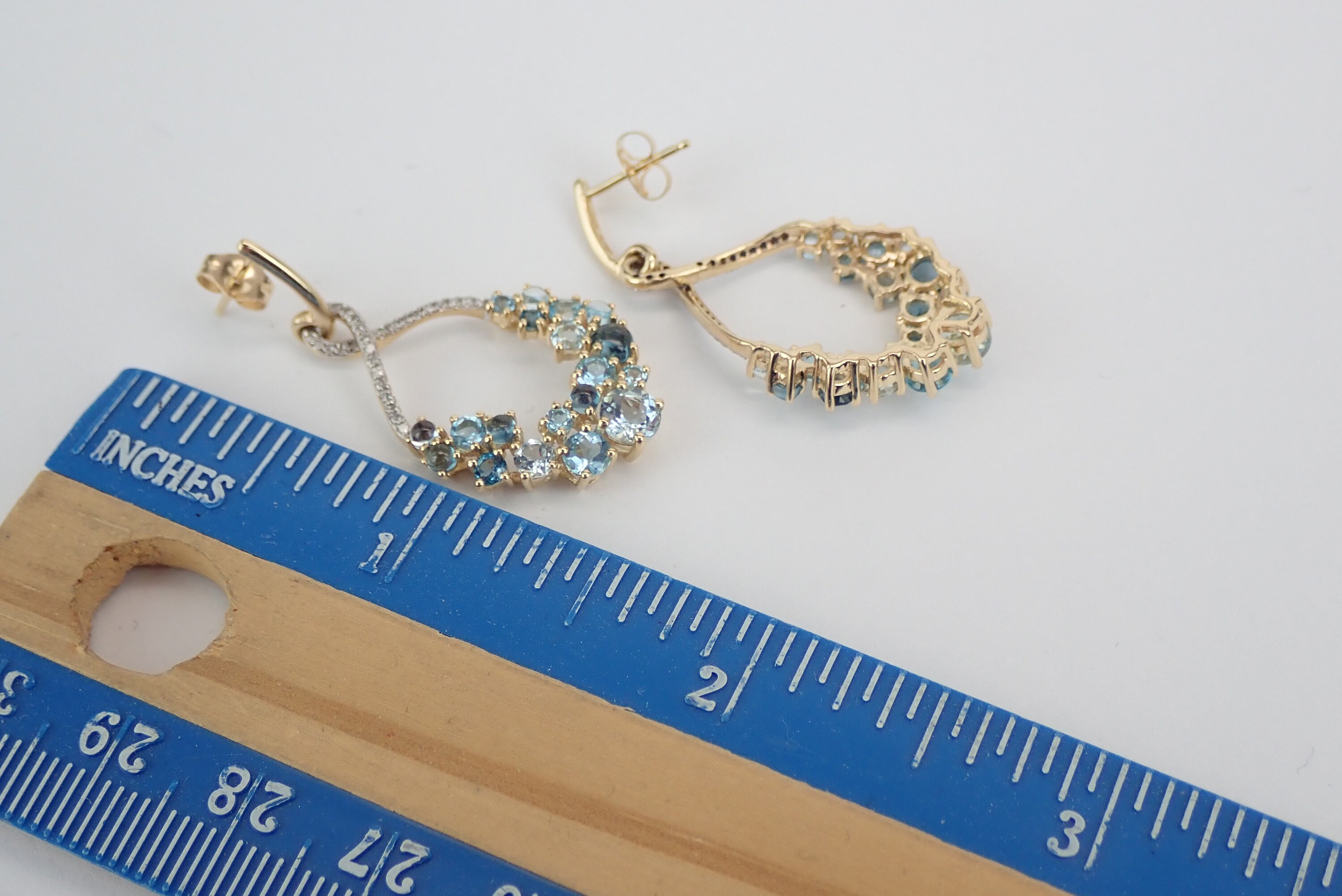 14K Yellow Gold Diamond and Multi Color Blue Topaz Dangle Earrings.There are nineteen genuine Round Blue Topaz and twenty-five natural Round Brilliant Diamonds set in EACH earring. The diamonds in these earrings are H color, I1 clarity and weigh a total of .25 carat. The Blue Topaz are a mix of different color blues and weigh a total of 1 1/4 carats. These earrings are 14KT Yellow Gold, measure 37 mm in length and weigh a total of 5.8 grams. These earrings are for pierced ears and have a friction back posts. These earrings will be accompanied by an appraisal written by a GIA Certified Diamond Grader with the retail replacement value of $1,589.00. I will ship these earrings promptly in a gift box.