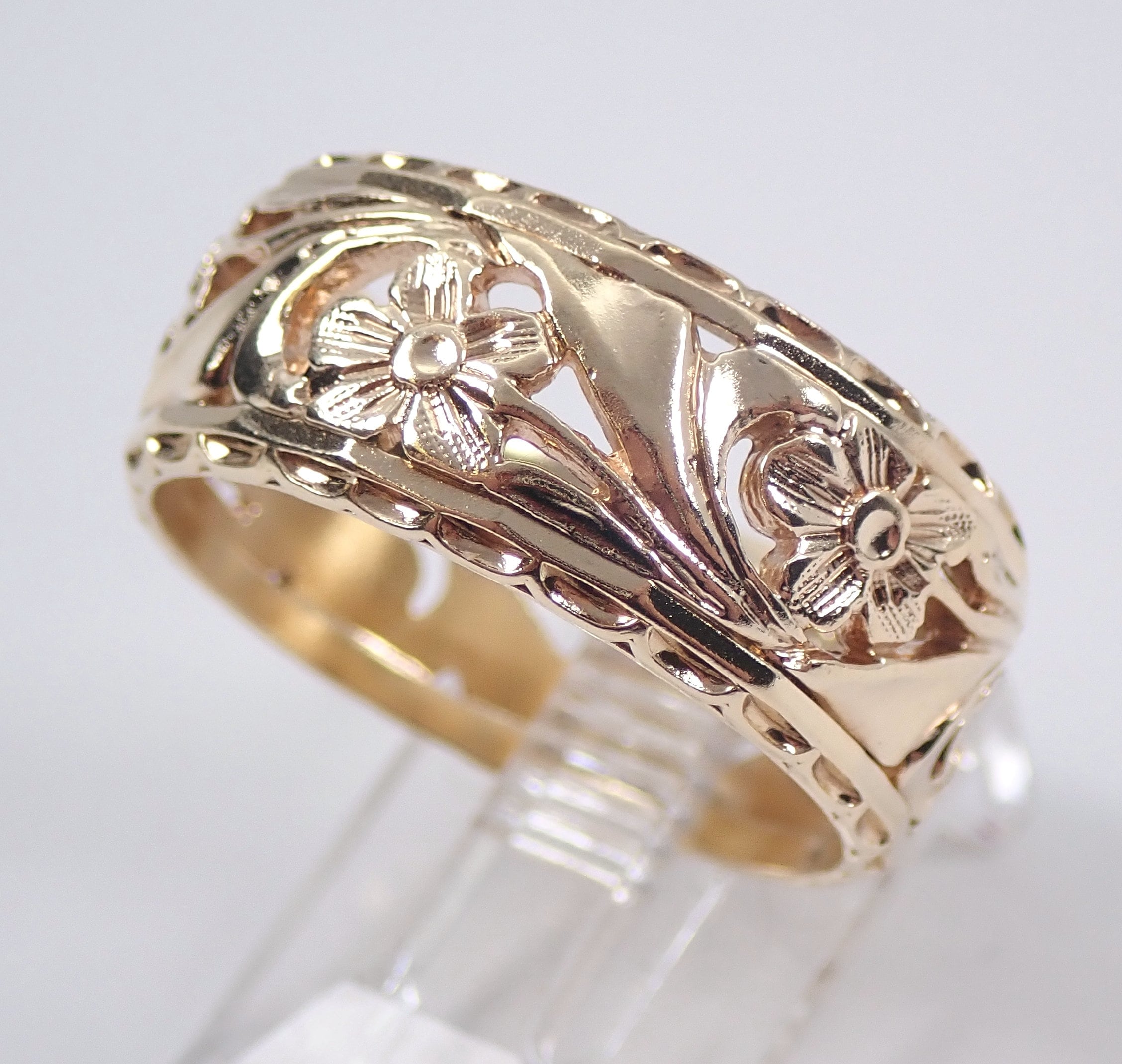 Antique vintage Floral wedding ring anniversary band. This ring is 14K Yellow Gold, weighs 6.1 grams, measures 9 mm in width and is a finger size 8 1/2. This ring dates back to Circa 1950's and will also be accompanied by an appraisal by a GIA Certified Diamond Grader with the replacement value of $985.00. I will ship this ring promptly in a beautiful gift box.