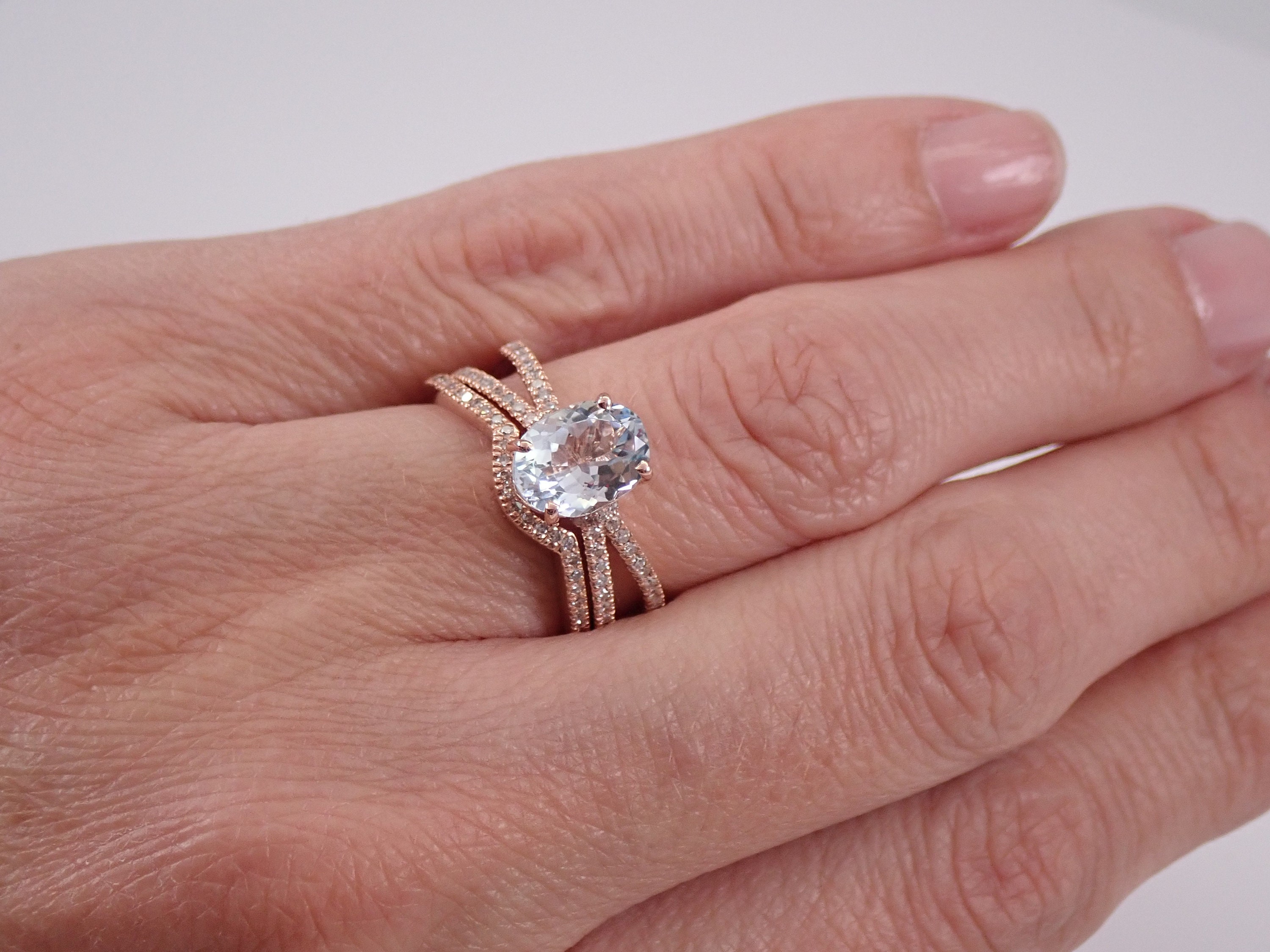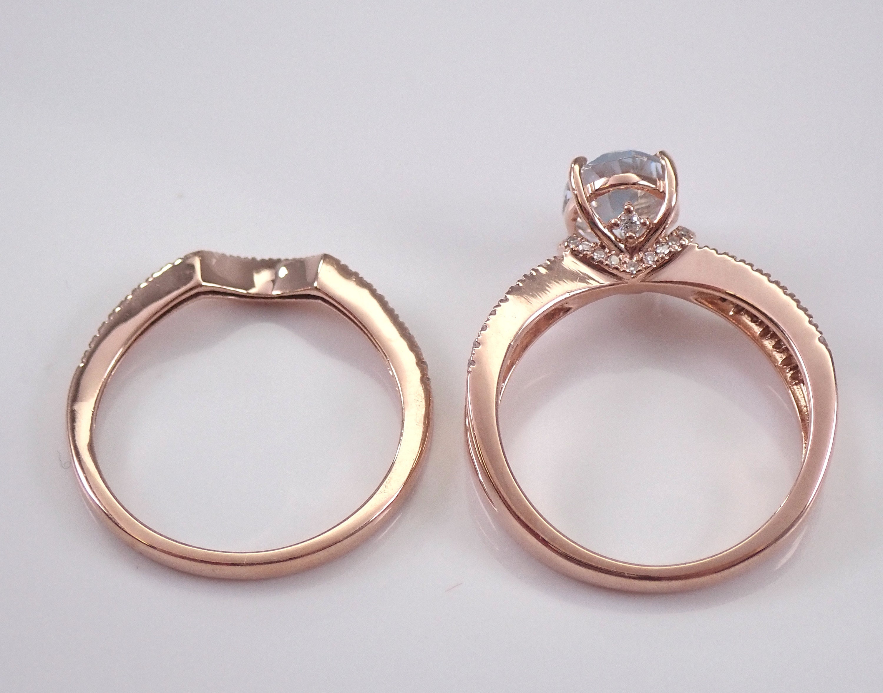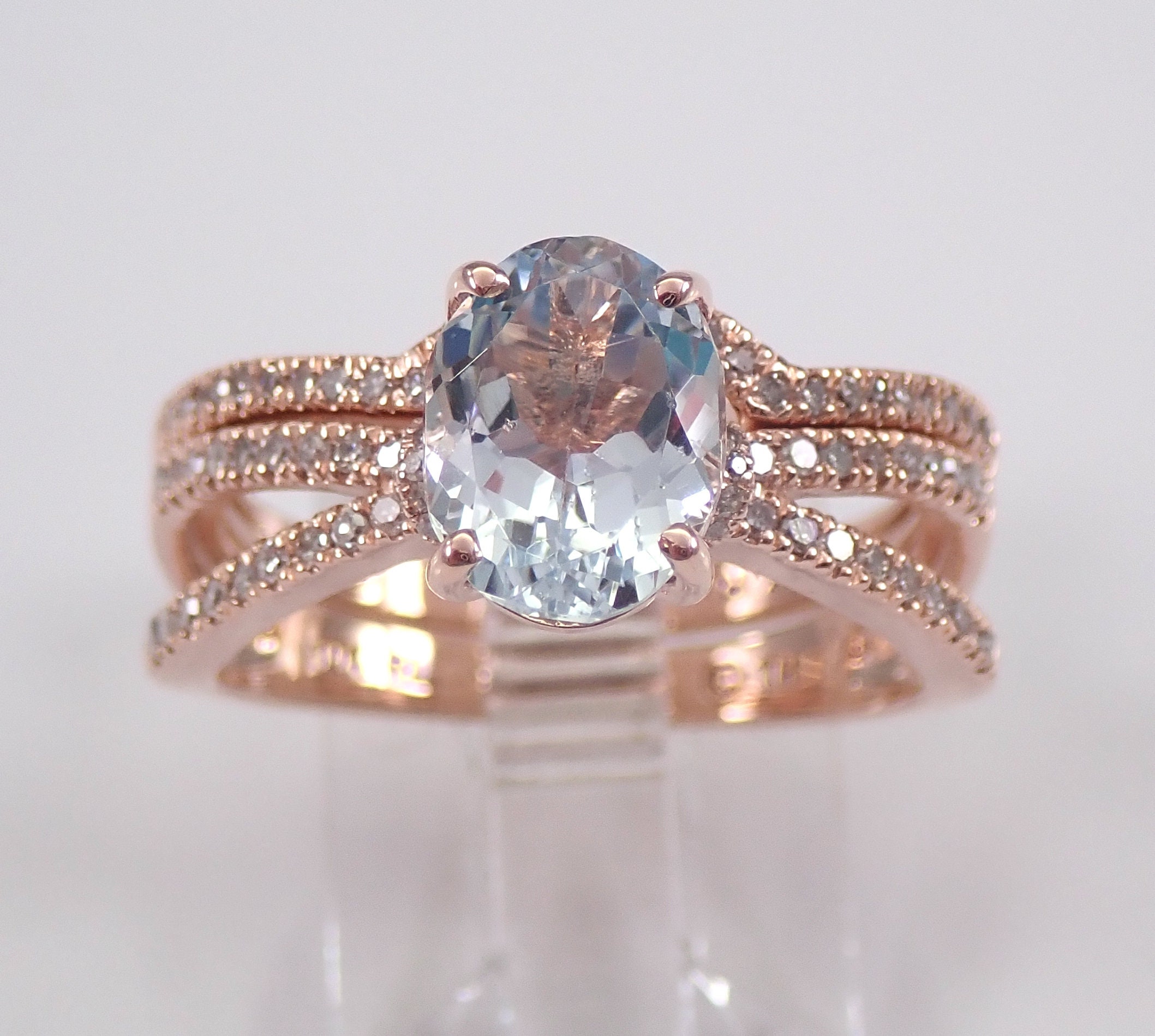 Rose Gold Diamond and Aquamarine Engagement Ring Wedding Band Set. This ring is set with one genuine Oval Aquamarine in the center and sixty-two natural Round diamonds in the engagement ring. The Aquamarine measures 8.5 X 6.5 mm and weighs 1 1/2 carat. The diamonds are H color, SI clarity and weigh a total of .40 carat. There are twenty-eight Round Brilliant Diamonds set in the matching wedding band. These diamonds are H color, SI clarity and weigh a total of .15 carat. These rings are 10 KT Rose Gold, weigh a total of 5.1 grams and are a finger size 7, which are resizable (please inquire about sizing with the finger size you need). These rings will be accompanied by an appraisal by a GIA Certified Diamond Grader with the retail replacement value of $2,195.00. I will ship this ring promptly in a gift box.