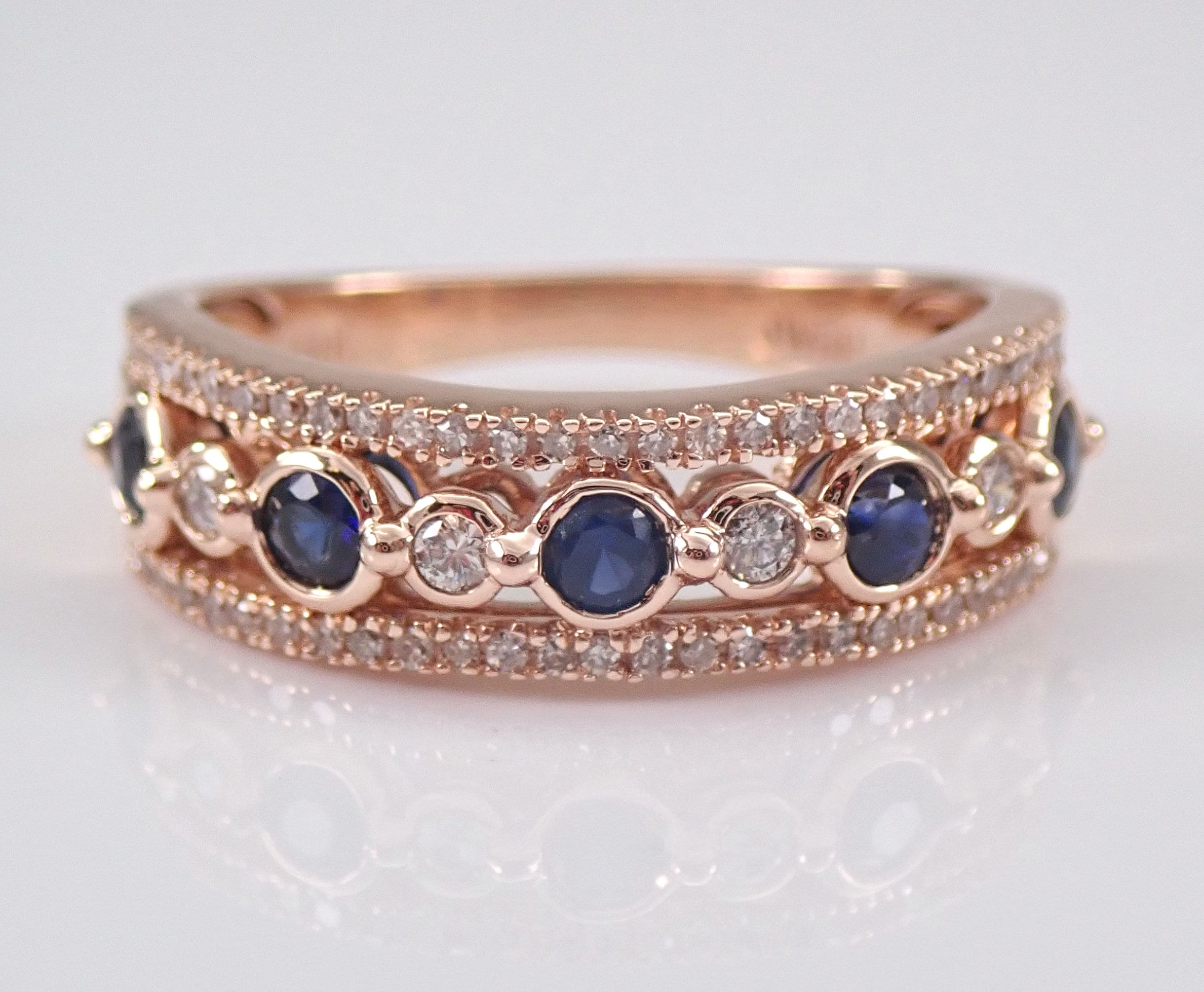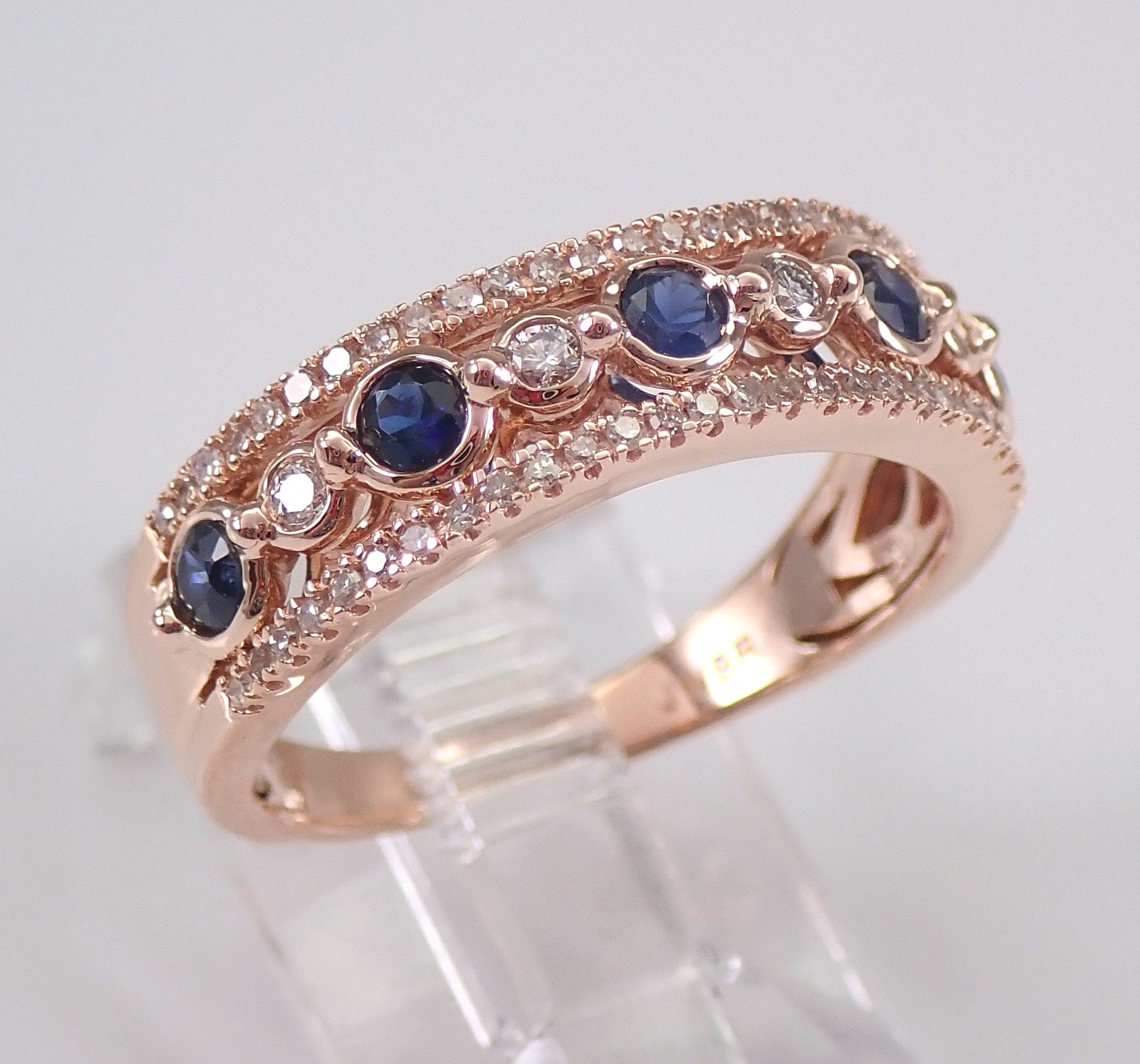 Diamond and Sapphire wedding ring anniversary band set in 14K Rose Gold. This ring is set with fifty-eight genuine Round Brilliant Diamonds and five natural Round Sapphires. These diamonds are H color, SI clarity and weigh a total of .35 carat. The Sapphires weigh a total of 1/2 carat. This ring is 14KT Rose Gold, weighs 3.8 grams, measures 6 mm in width and is a finger size 6 3/4, can be resized. This ring will also be accompanied by an appraisal by a GIA Certified Diamond Grader with the replacement value of $1,695.00. I will ship this ring promptly in a beautiful gift box.