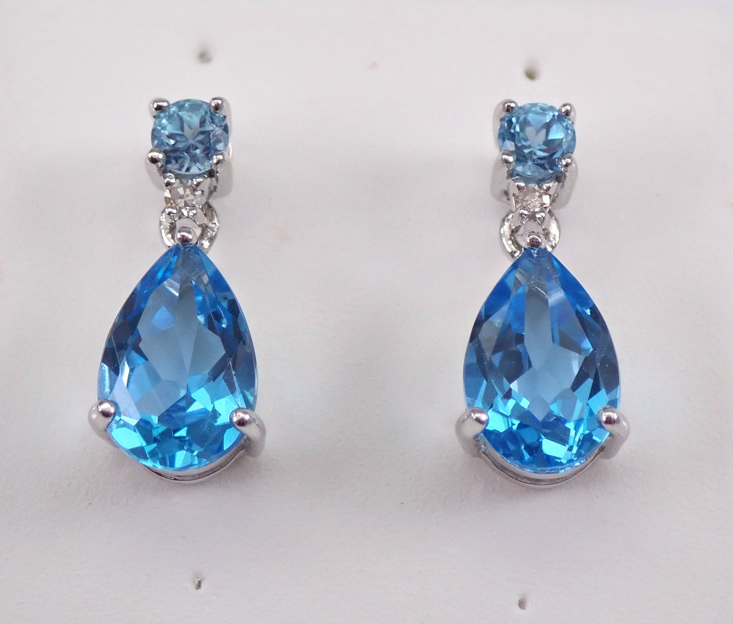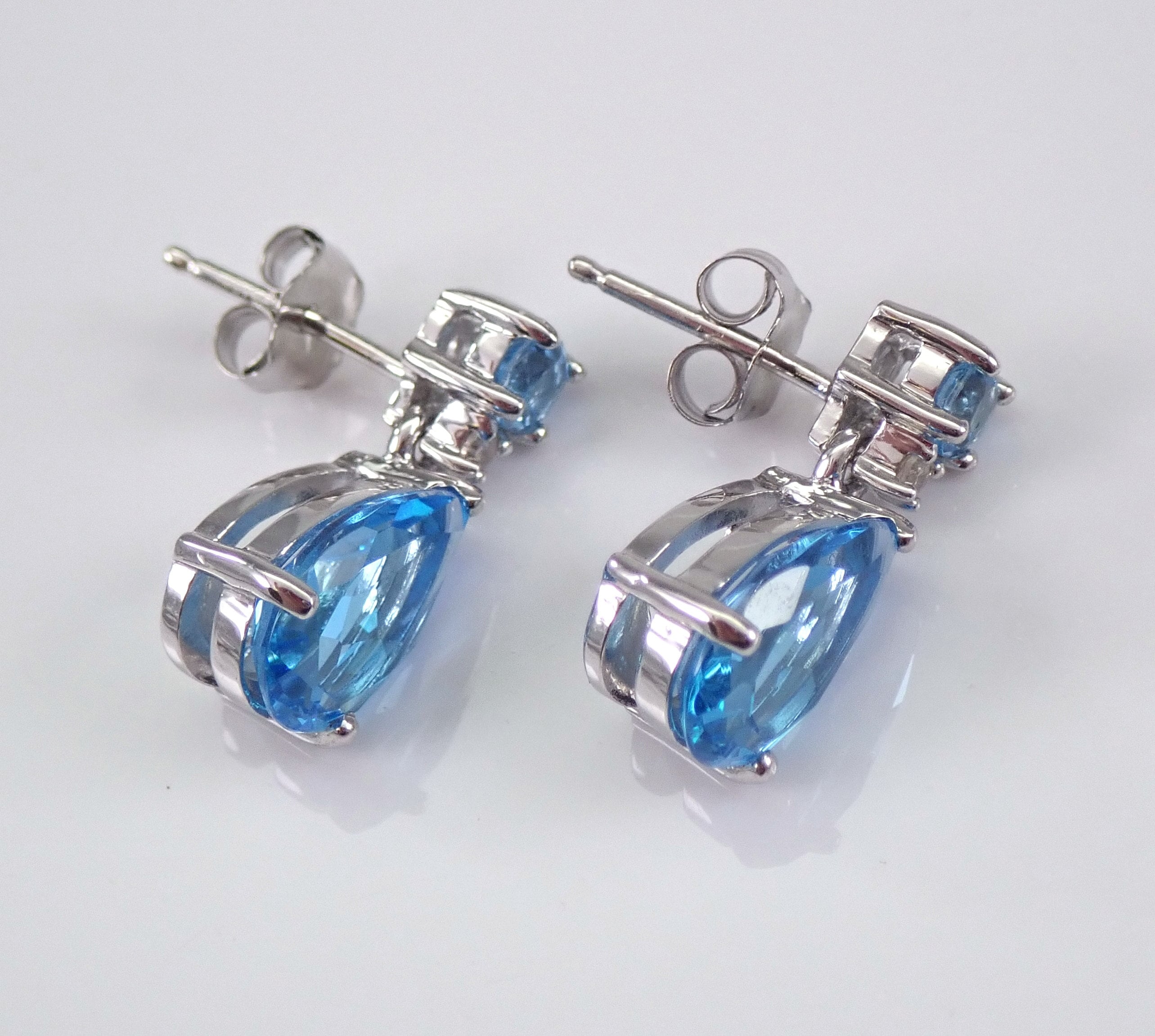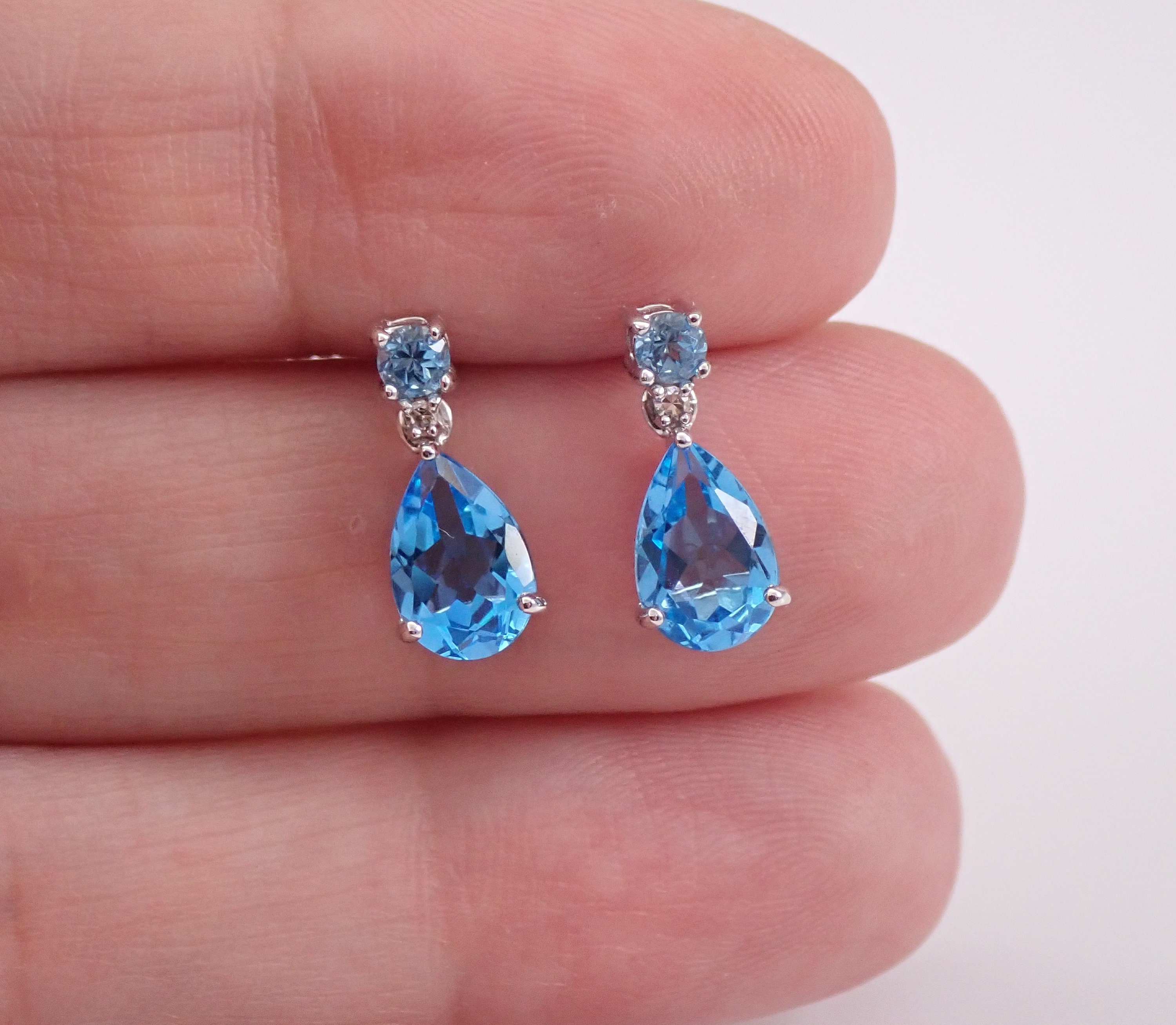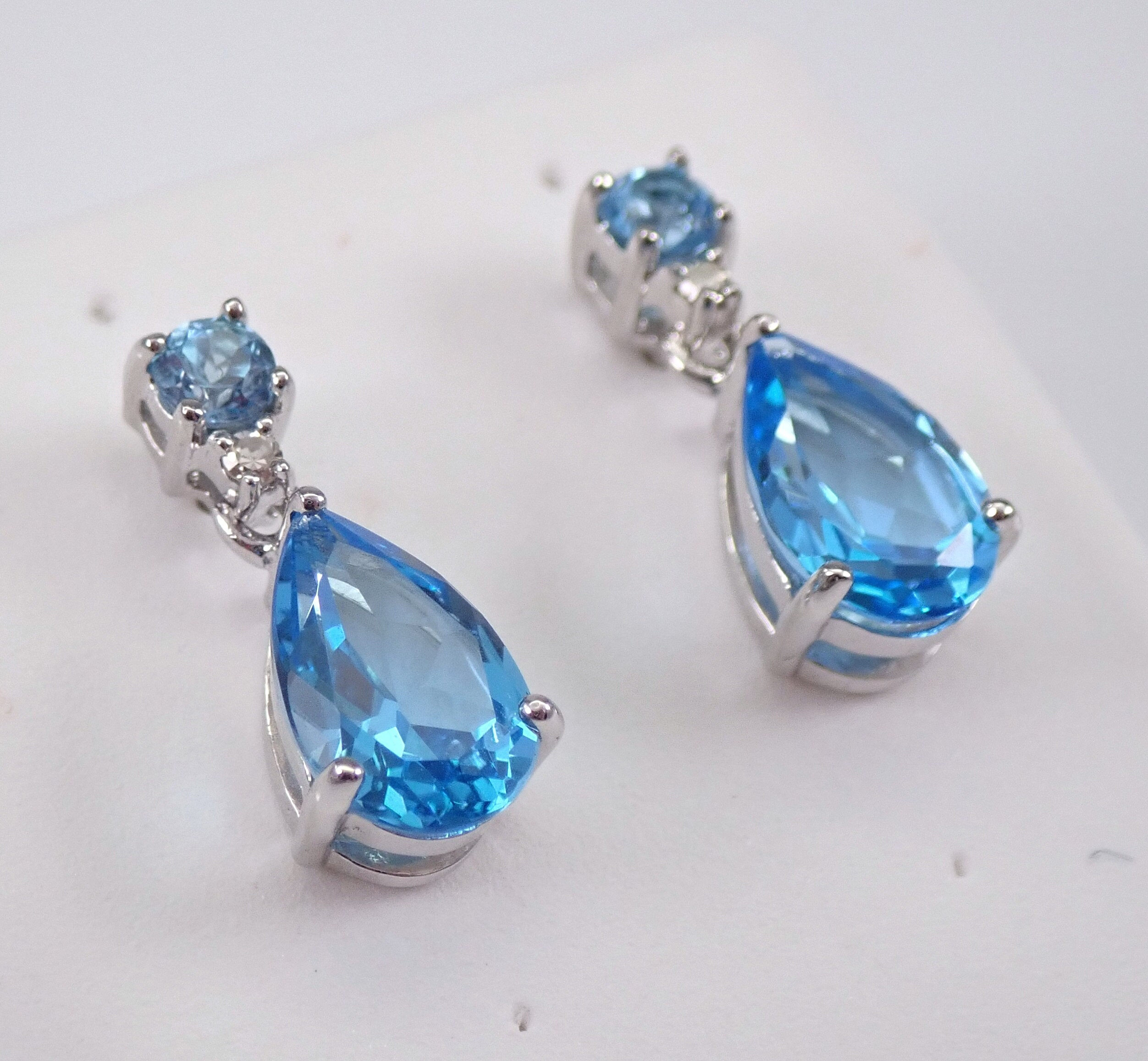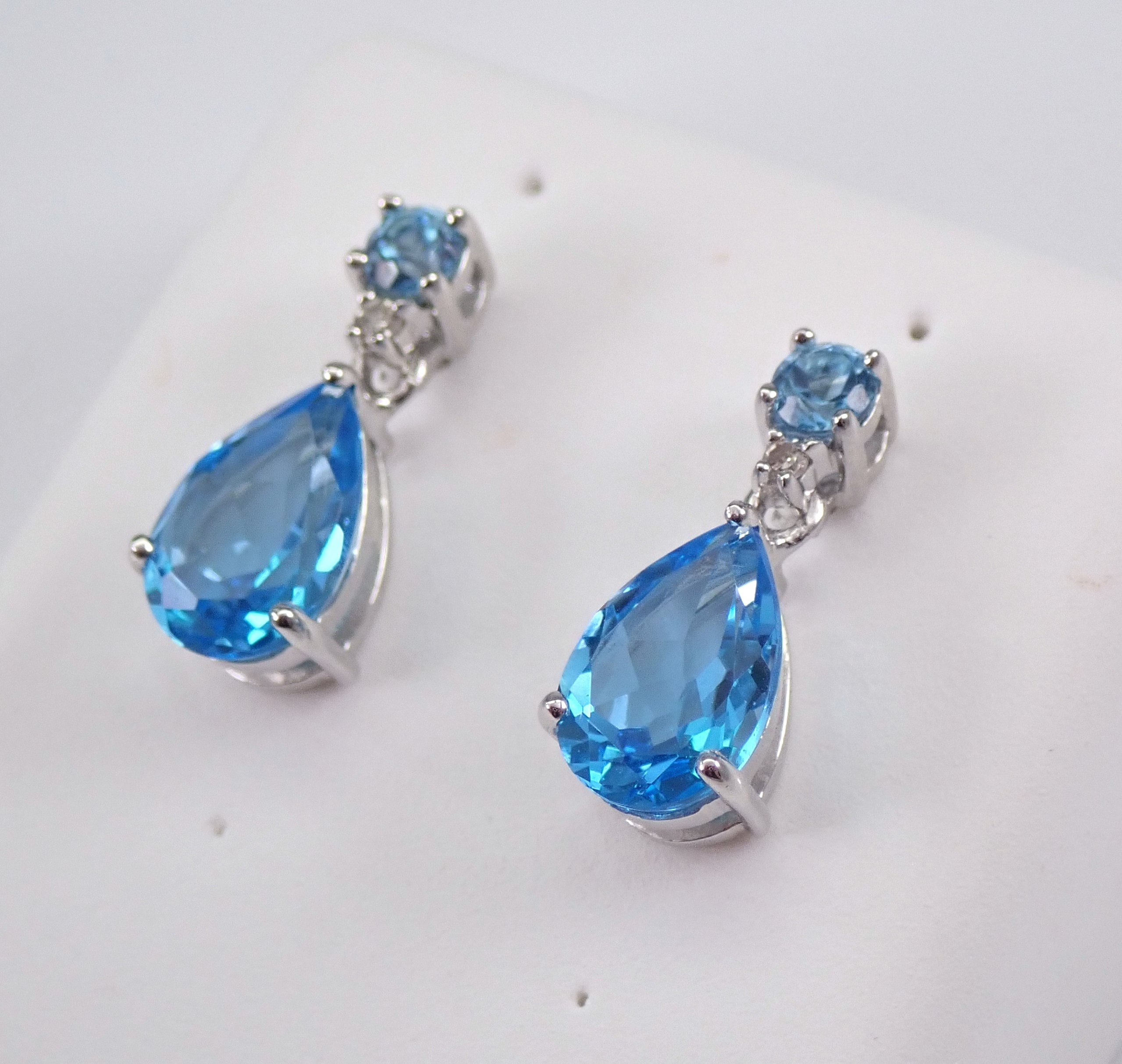 White Gold Diamond and Blue Topaz Dangle Teardrop Earrings. There are two genuine Pear shaped Blue Topaz, two Round Blue Topaz and two Round Diamonds set in these earrings. The Pear shaped Blue Topaz measure 9 X 5.5 mm and the Round Blue Topaz measure 3 mm in diameter. These gemstones combine to a total weight of 2 1/4 carats. The diamonds in these earrings are H color, SI clarity and weigh a total of .03 carat. These earrings are 10KT White Gold, measure 15 mm in length and weigh a total of 2.2 grams. These earrings are for pierced ears and have a friction back posts. These earrings will be accompanied by an appraisal written by a GIA Certified Diamond Grader with the retail replacement value of $1,235.00. I will ship these earrings promptly in a gift box.