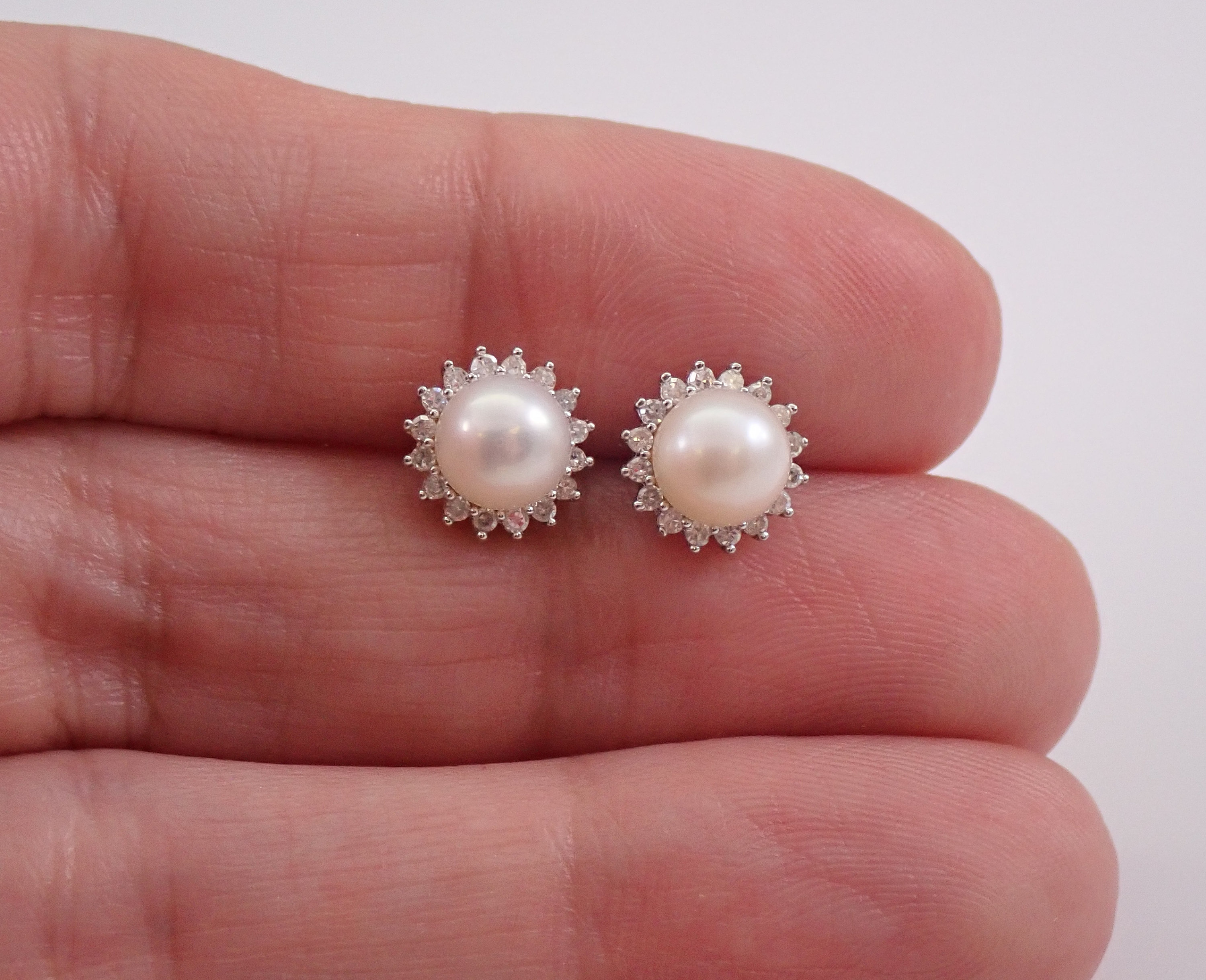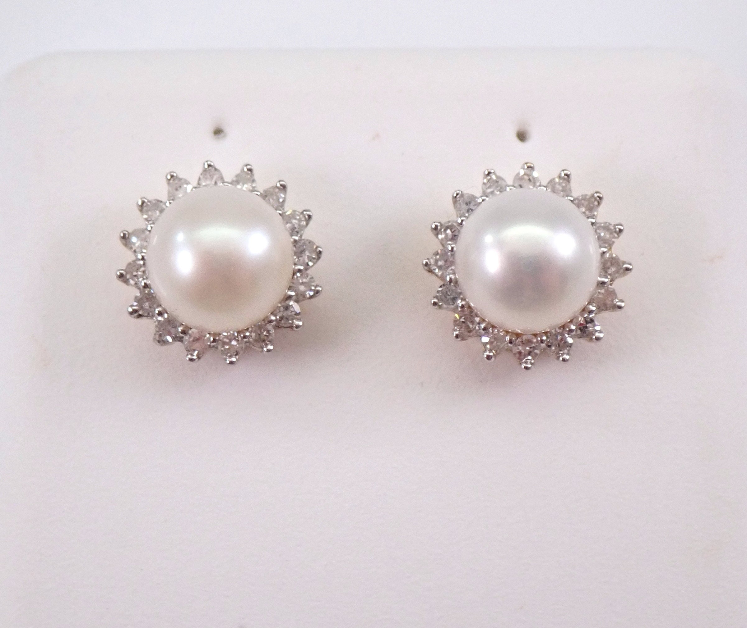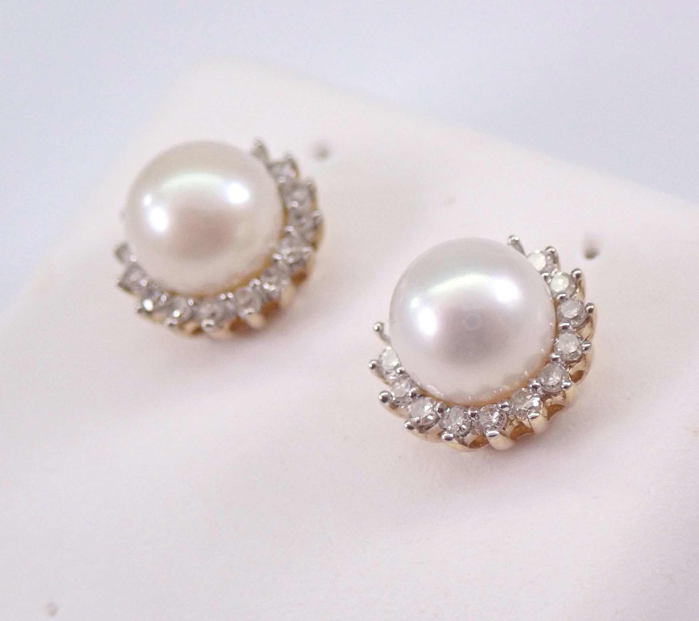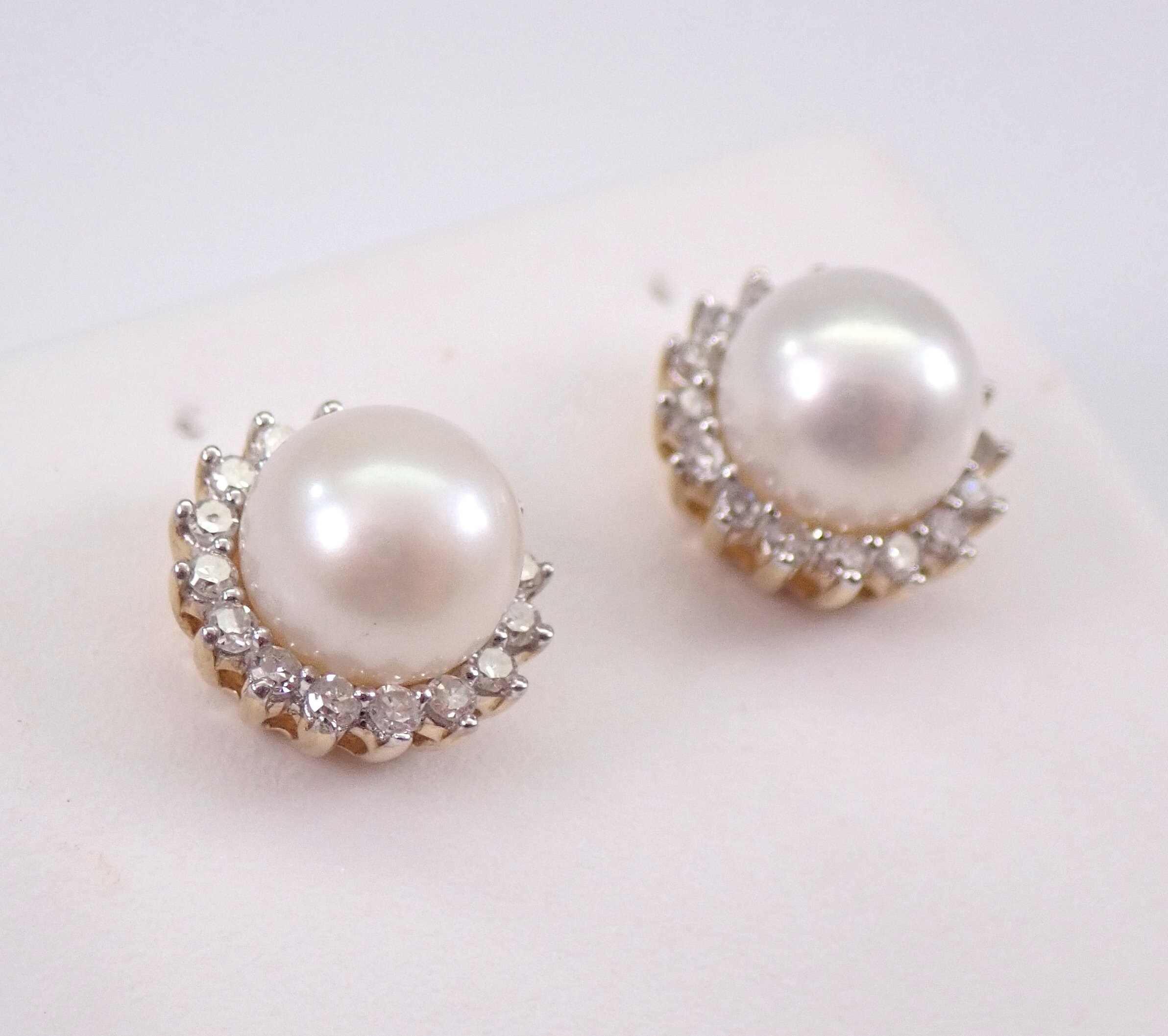 Yellow Gold Pearl and Diamond Halo Stud Earrings. These earrings are set with two Round White Pearls and thirty-two genuine Round Diamonds. These Pearls measure 6 mm in diameter each. The Diamonds in these earrings are H color, I1 clarity and weigh a total of .20 carat. These earrings are 10KT Yellow Gold and weigh a total of 1.8 grams. These earrings are for pierced ears, measure 8.5 mm in diameter and the earrings have friction post backings. These earrings will be accompanied by an appraisal written by a GIA Certified Diamond Grader with the retail replacement value of $795.00. I will ship these earrings promptly in a gift box.