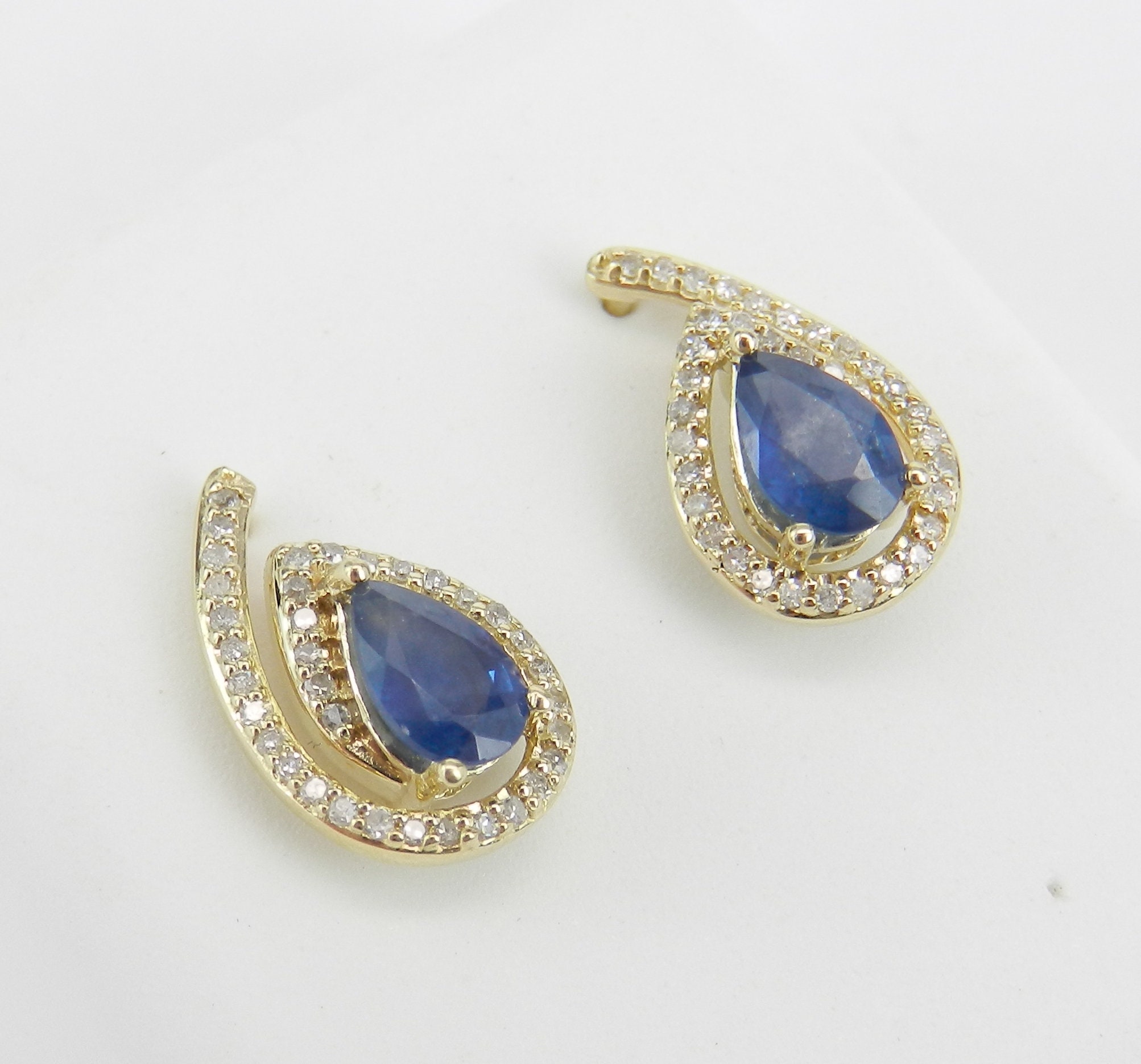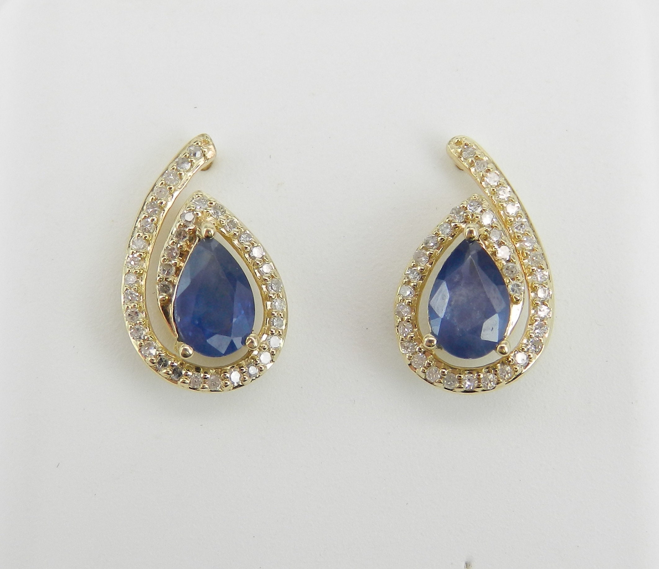 Yellow Gold Diamond and Sapphire Stud Earrings. These earrings are set with a genuine Pear shaped Sapphire in each earring. These Sapphires are a medium blue color, measure 6 X 4 mm each and weigh a total of 1.20 carats. There are seventy natural Round Diamonds set in these earrings. These Diamonds are H color, SI/I clarity and amount to a total weight of .30 carat. These earrings weigh 2.0 grams and measure 13 X 8 mm each. These earrings are for pierced ears and the earrings have friction post backs. These earrings will be accompanied by an appraisal written by a GIA Certified Diamond Grader with the retail replacement value of $1,395.00. I will ship these earrings promptly in a gift box.