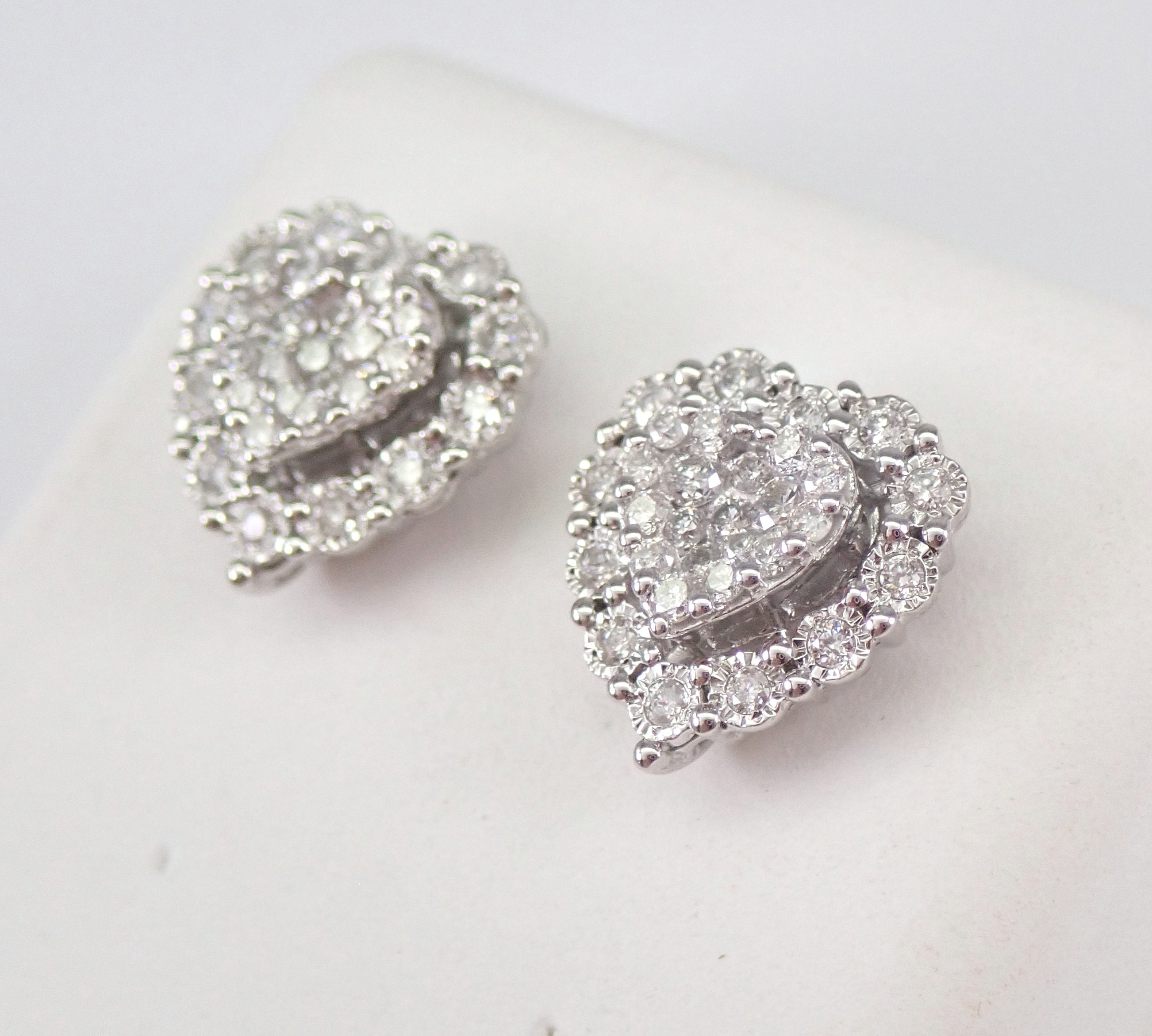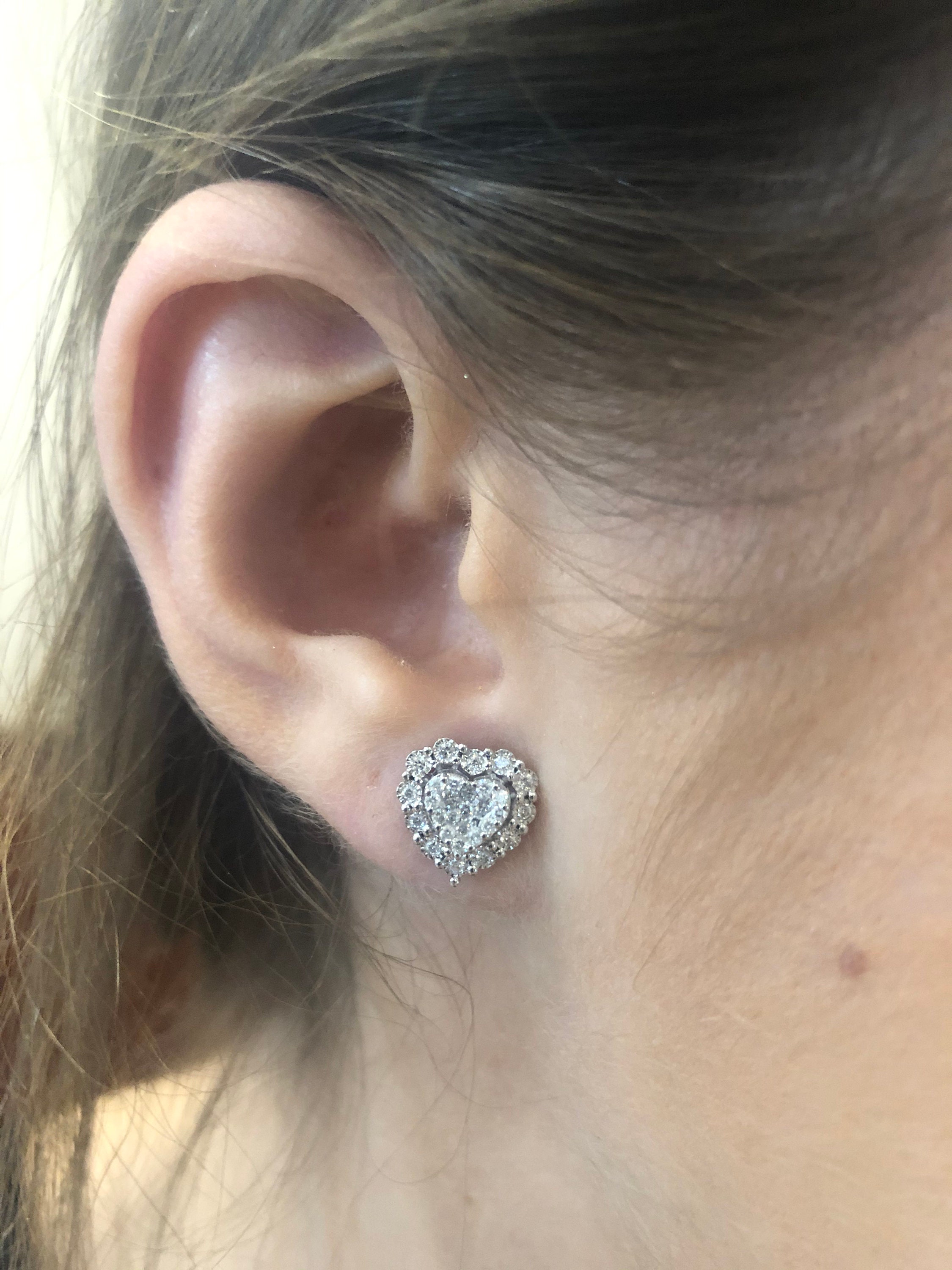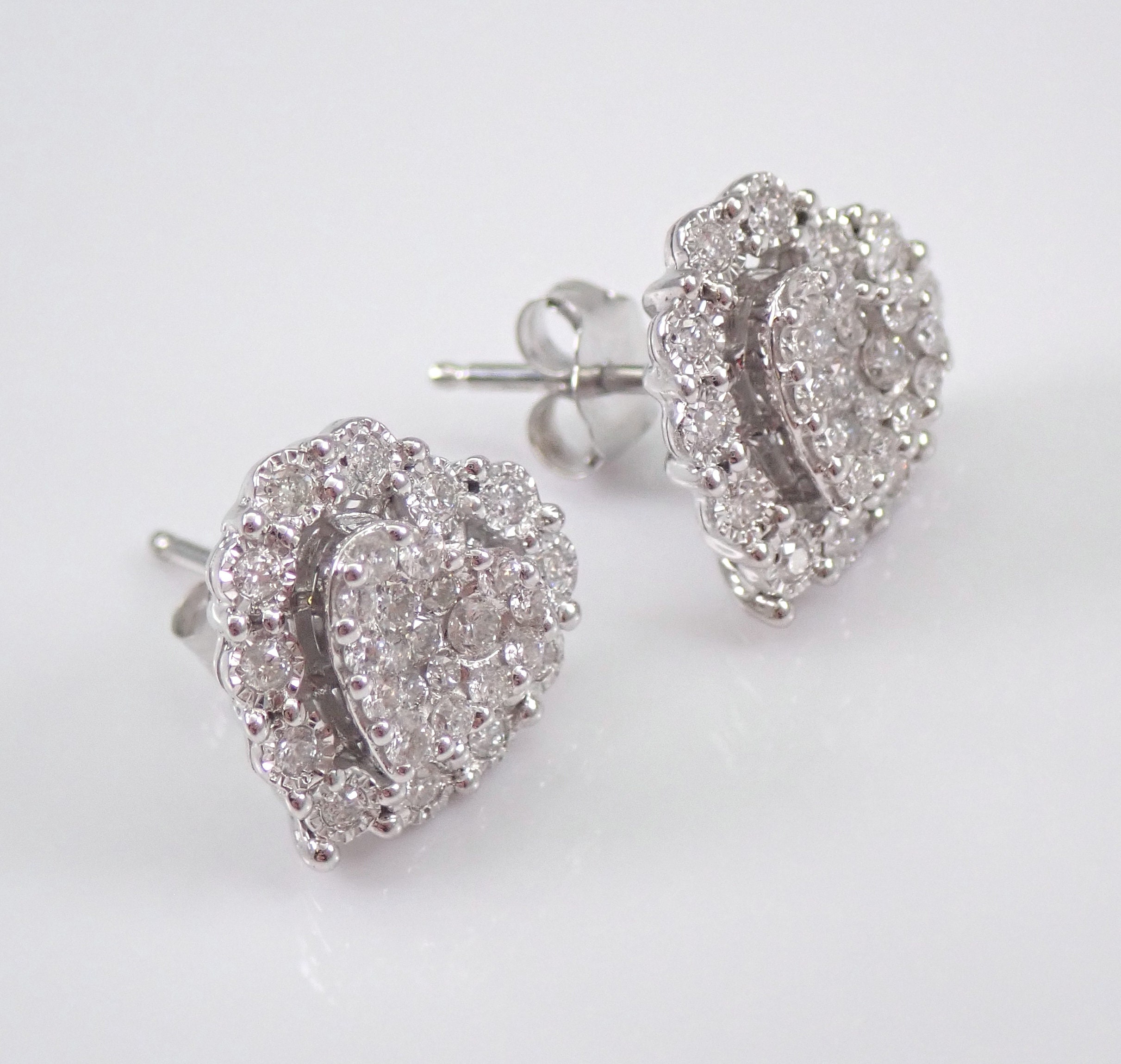 White Gold Diamond Heart Stud Earrings. These earrings are set with thirty natural Round Brilliant Diamonds in EACH earring. These Diamonds are H color, SI/I clarity and amount to a total weight of 1/2 carat. These earrings are 10K White Gold, weigh 2.6 grams and measure 11 X 10.5 mm each. These earrings are for pierced ears and the earrings have secure friction back posts. These earrings will be accompanied by an appraisal written by a GIA Certified Diamond Grader with the retail replacement value of $1,385.00. I will ship these earrings promptly in a gift box.