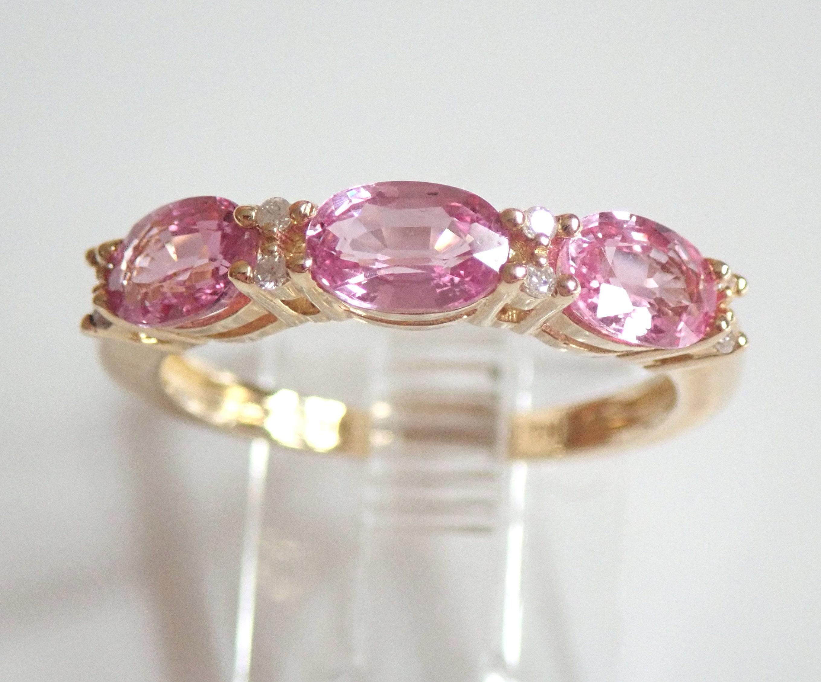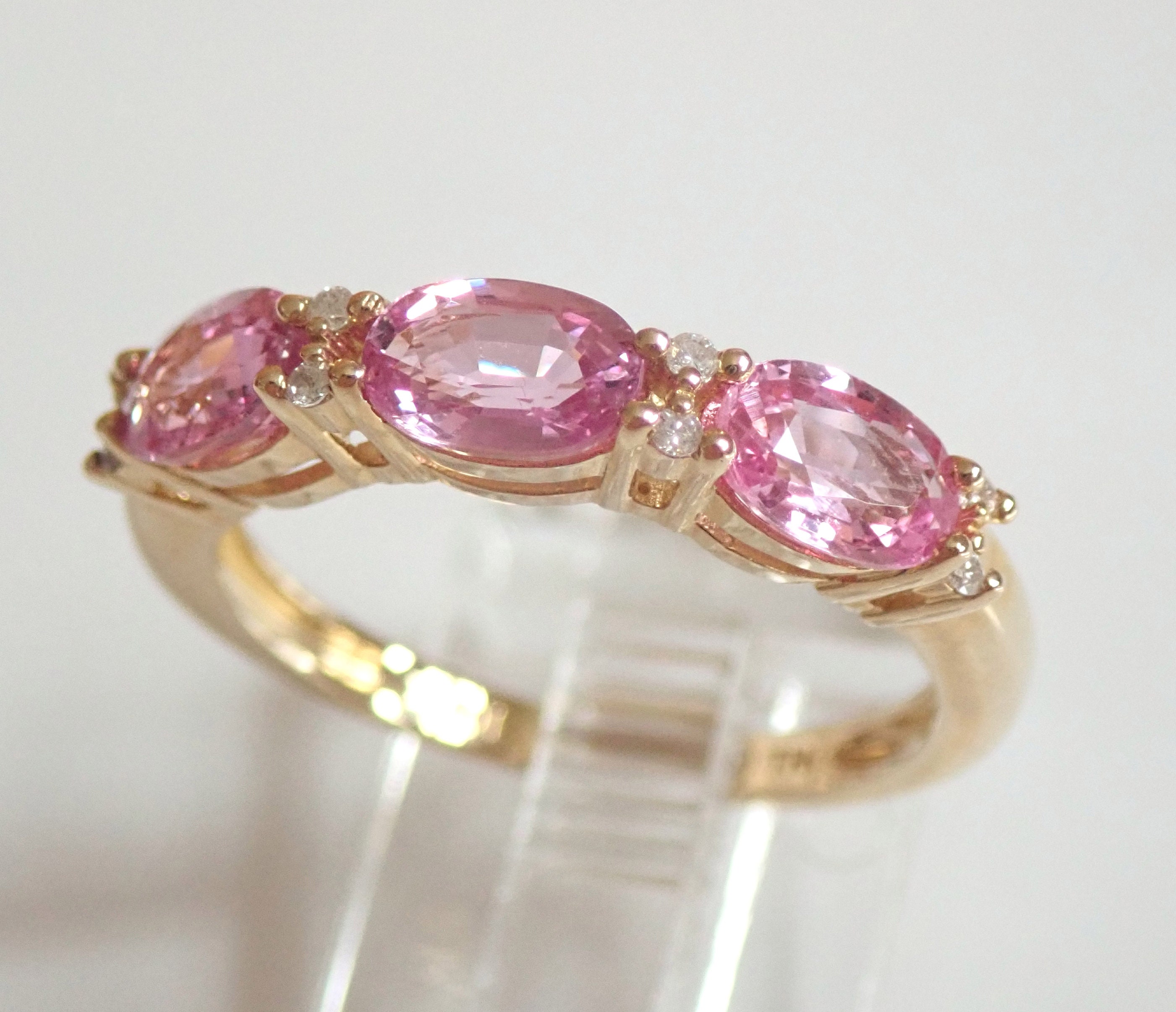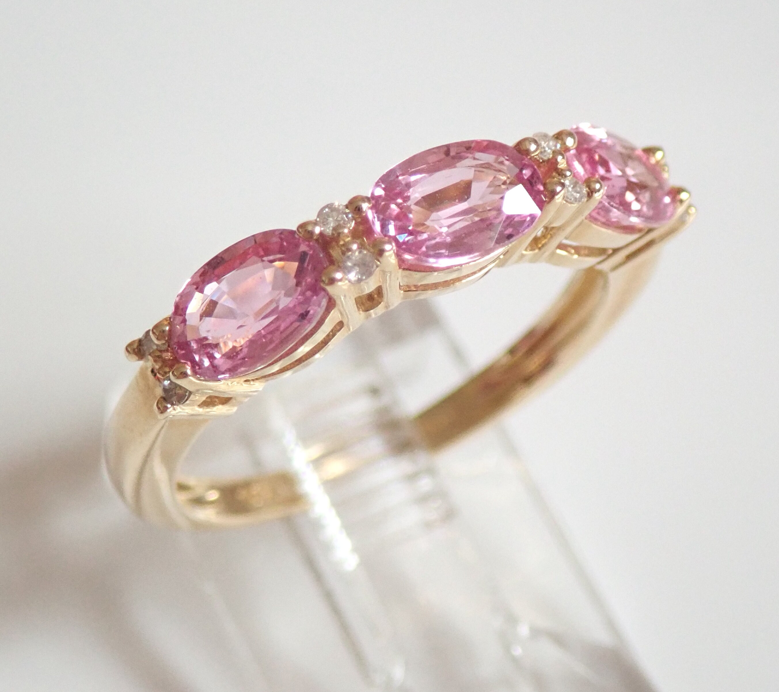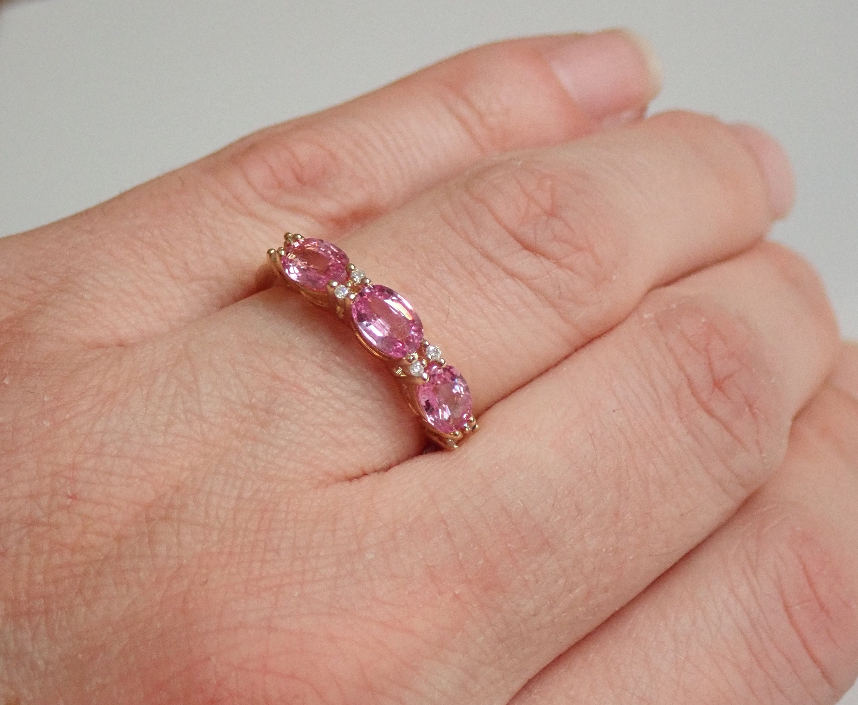 Yellow Gold Diamond and Pink Sapphire Wedding Ring Three Stone Anniversary Band. This ring is set with eight genuine Round Diamonds and three natural Oval Pink Sapphires. These diamonds are H color, SI/I clarity and weigh a total of .08 carat. The Pink Sapphires in this ring are a brilliant pink color, measure 6 X 4 mm each and weigh a total of 1.50 carats. This ring is 10KT Yellow Gold, weighs 2.6 grams, the band measures 4.5 mm in width and is a finger size 7, can be resized (please inquire about sizing with the finger size you need). This ring will also be accompanied by an appraisal by a GIA Certified Diamond Grader with the replacement value of $1,649.00. I will ship this ring promptly in a beautiful gift box.