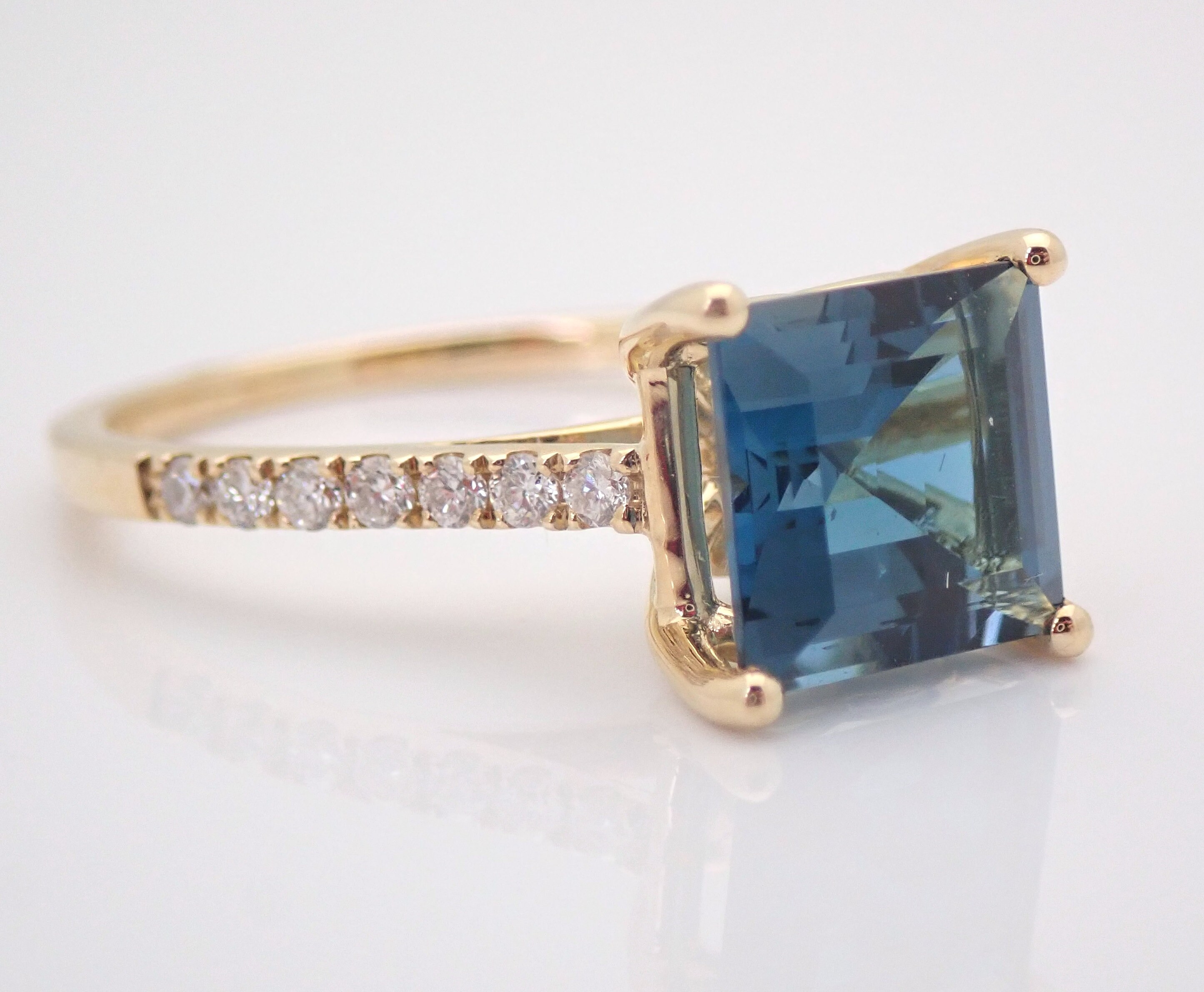 Yellow Gold Diamond and London Blue Topaz Engagement Ring. This ring is set in the center with one genuine Princess Cut London Blue Topaz. This London Blue Topaz measures 8 X 8 mm and weighs 2 carats. There are sixteen natural Round Brilliant Diamonds set in this ring. These diamonds are H color, SI/I in clarity and weigh a total of .20 carat. This ring is 10KT Yellow Gold, weighs 2.7 grams and is a finger size 7, which can be resized free of charge (please inquire about sizing with the finger size you need). This ring will be accompanied by an appraisal written by a GIA Certified Diamond Grader with the retail replacement value of $1,495.00. I will ship this ring promptly in a beautiful gift box.