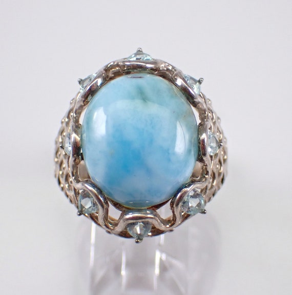 Vintage Sterling Silver Chalcedony and Sapphire Ring - Large Estate Gemstone Band - Unique Two Tone Jewelry Gift
